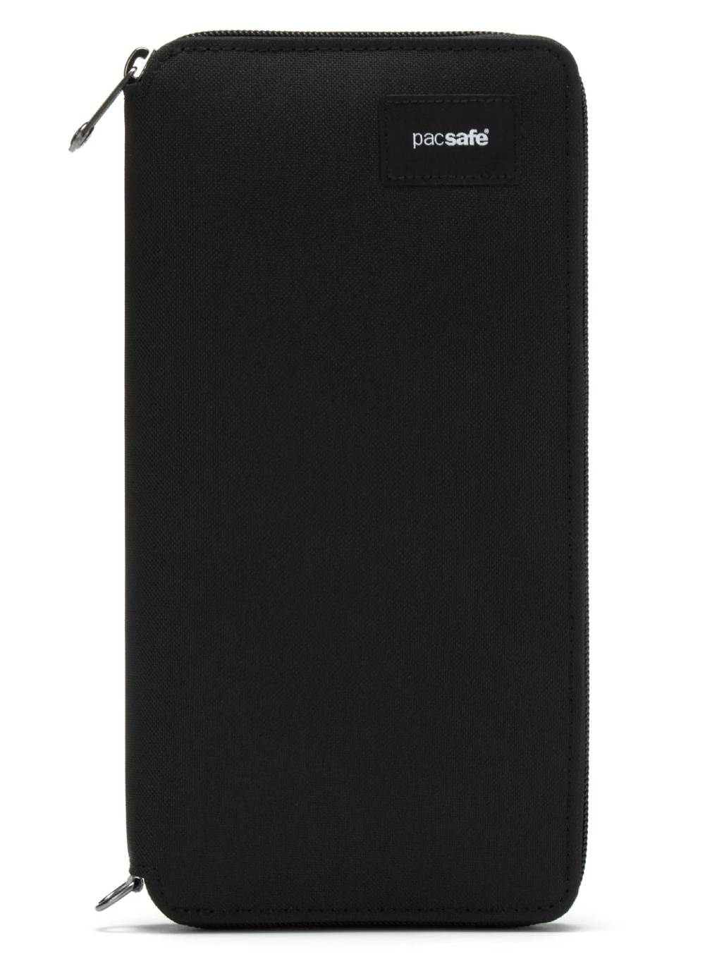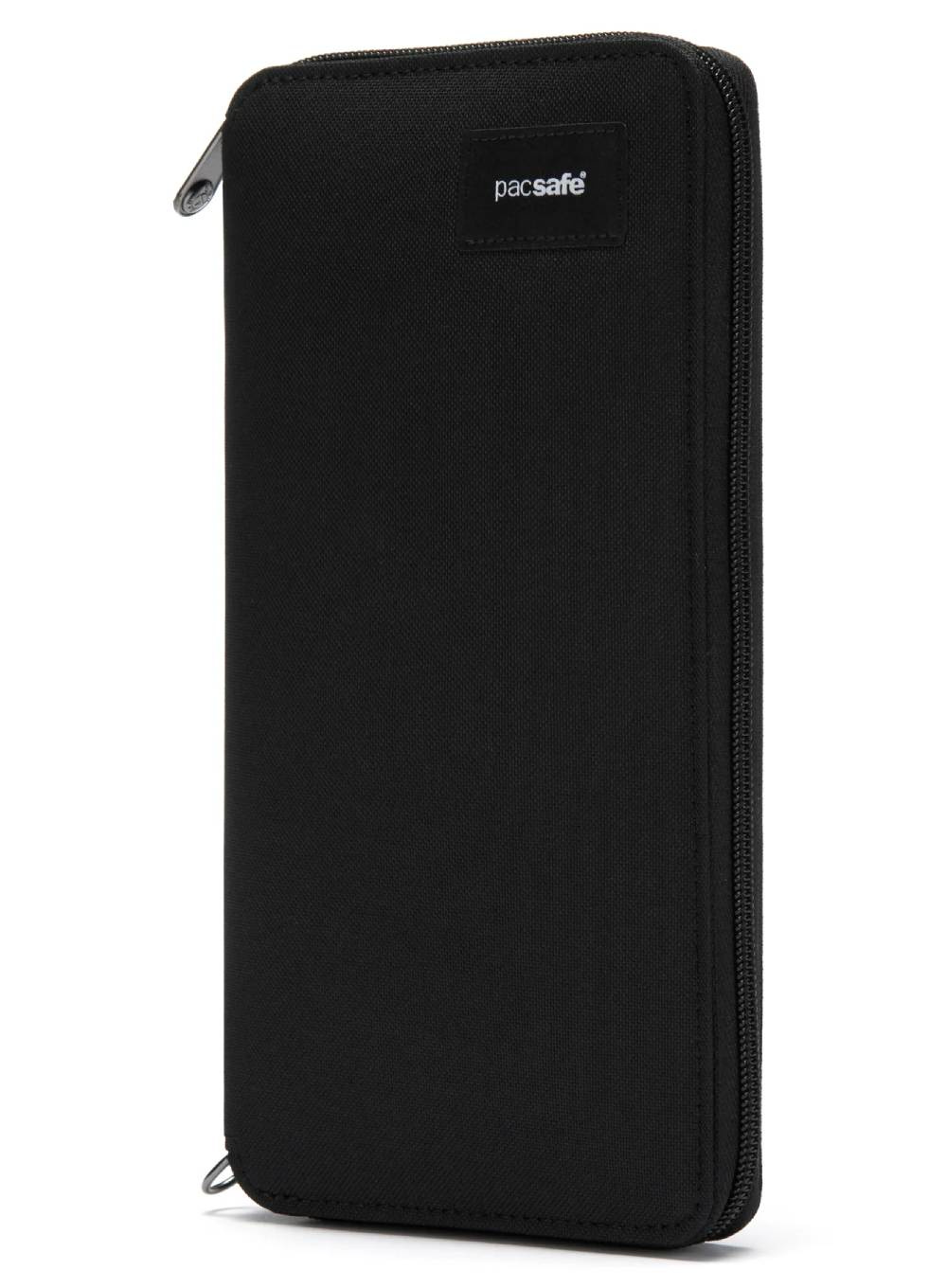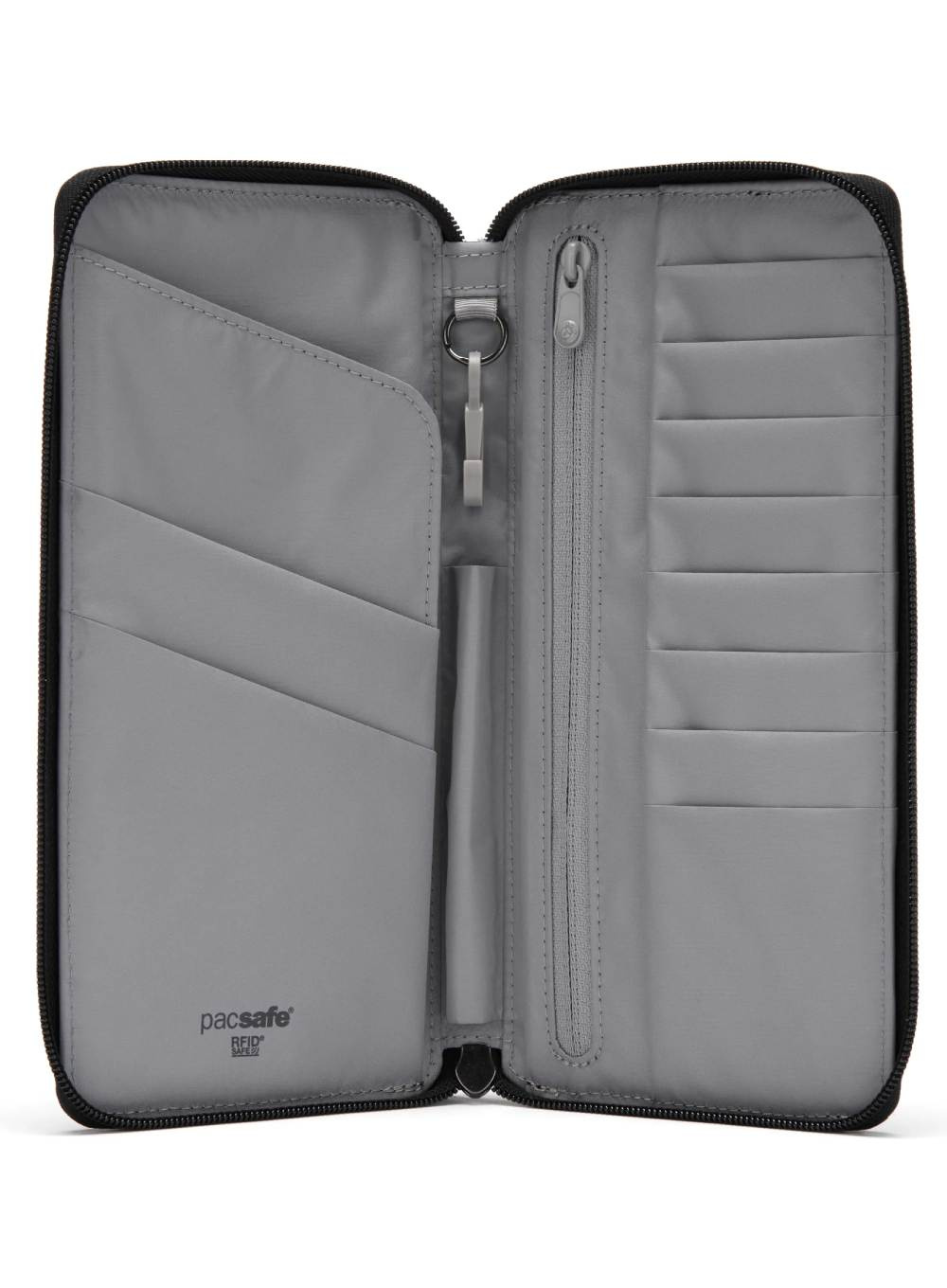 Pacsafe® RFIDsafe™ Travel Wallet to bezpieczny portfel podróżny chroniący dane kart i paszportów dzięki technologii RFID, z miejscem na 2 paszporty, karty, gotówkę i monety.
