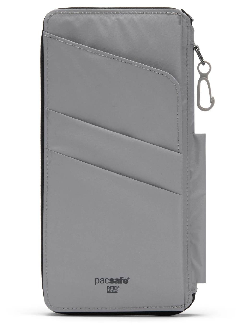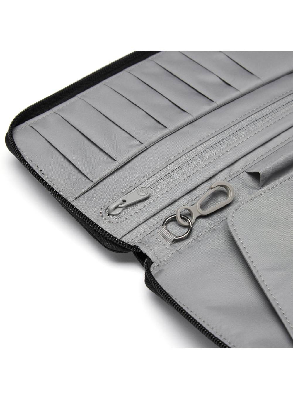 Portfel antykradzieżowy Pacsafe® RFIDsafe™ Travel Wallet to praktyczny i bezpieczny portfel dla podróżujących, który pozwala przechowywać paszporty, karty, gotówkę, bilety i monety w jednym miejscu. Wyposażony w szybki dostęp do paszportu i biletu, ułatwia kontrolę podczas podróży.