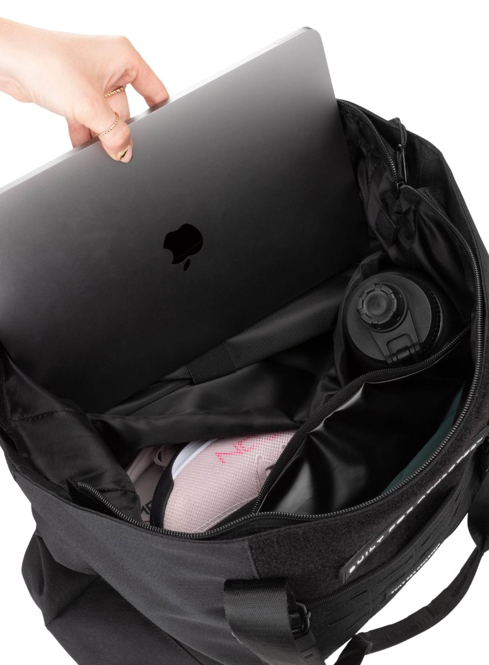 Model posiada dużą komorę główną, wodoodporną kieszeń wewnętrzną, wyściełaną przegrodę na laptopa oraz praktyczne przegródki na drobiazgi. Dodatkowe rozwiązania, takie jak regulowane paski do przenoszenia maty do jogi, wewnętrzny uchwyt na napój czy panel na rzepy do personalizacji, czynią ją idealnym wyborem zarówno na trening, jak i do pracy czy szkoły.