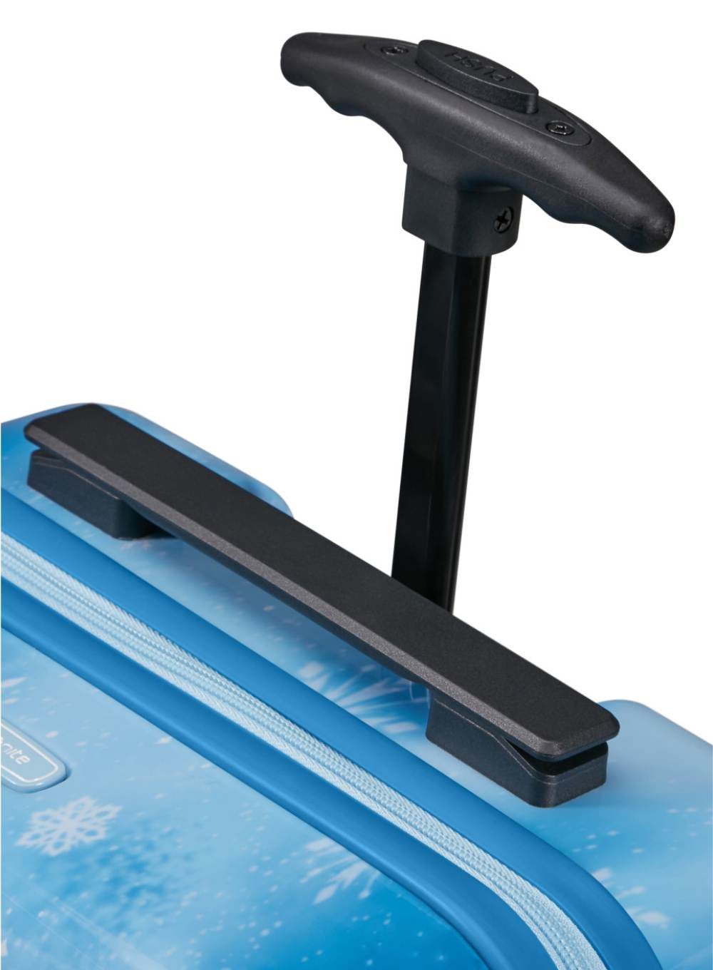Obudowa wykonana z wytrzymałego poliwęglanu zapewnia odporność na uszkodzenia, a cztery kółka i teleskopowa rączka umożliwiają dziecku łatwe prowadzenie walizki samodzielnie.