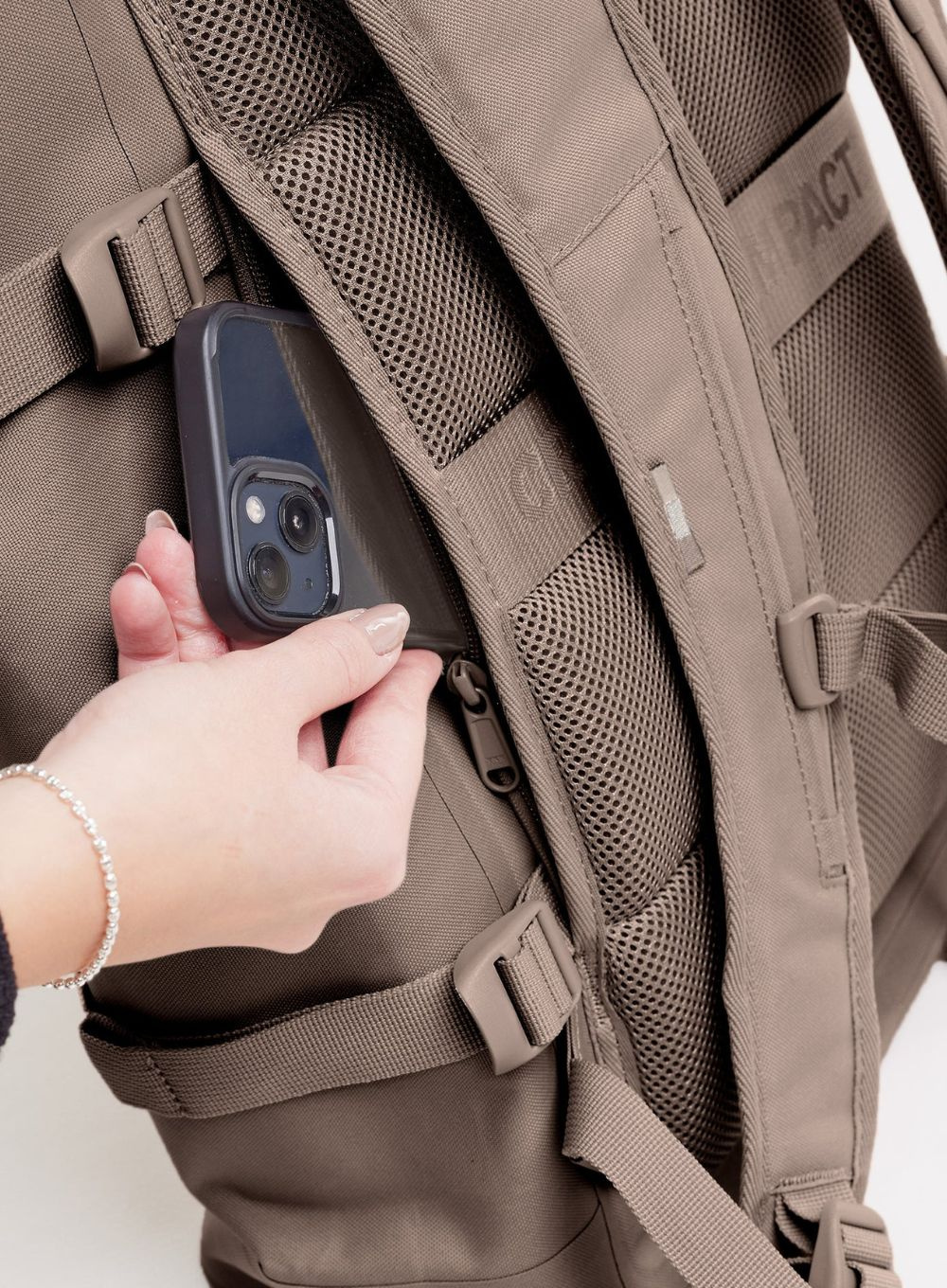 Plecak posiada pasek do mocowania na walizce i mieści format DIN A3. Powstał z materiałów pochodzących z recyklingu, wolny od PVC i PFAS, a jego trwałość i odporność zapewniają komfort w codziennym użytkowaniu.