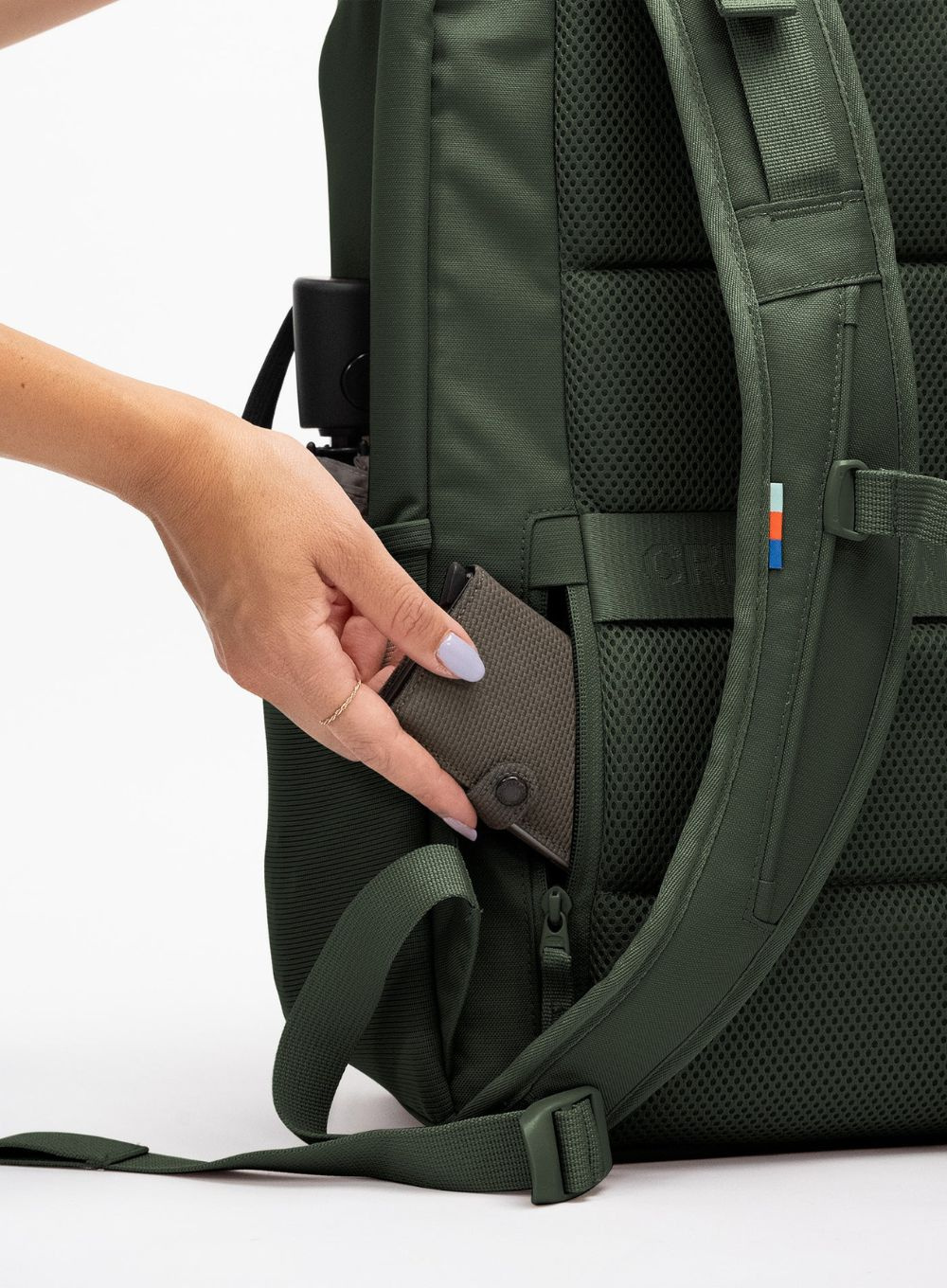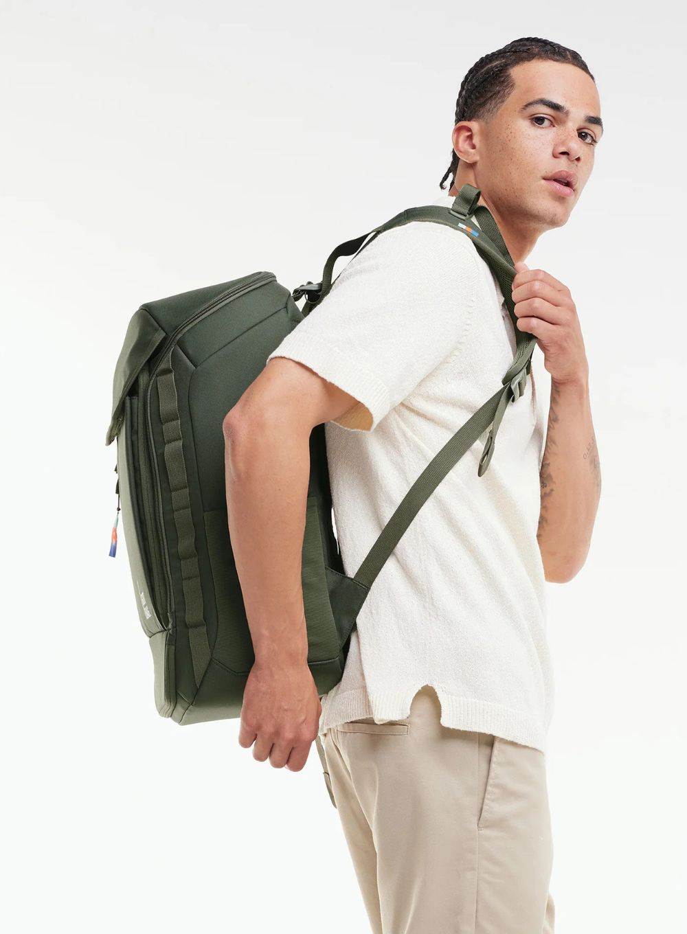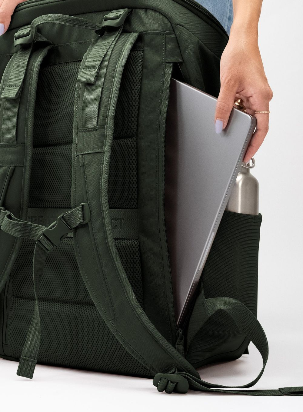W zestawie znajduje się dodatkowy organizer (packing cube) z siatki, wykonany z recyklingowanego poliestru. Plecak powstał z materiałów pochodzących z recyklingu Ocean Impact Plastic, jest wodoodporny, wolny od PFAS i PVC, a dzięki certyfikacji bluesign® spełnia wysokie standardy zrównoważonej produkcji.