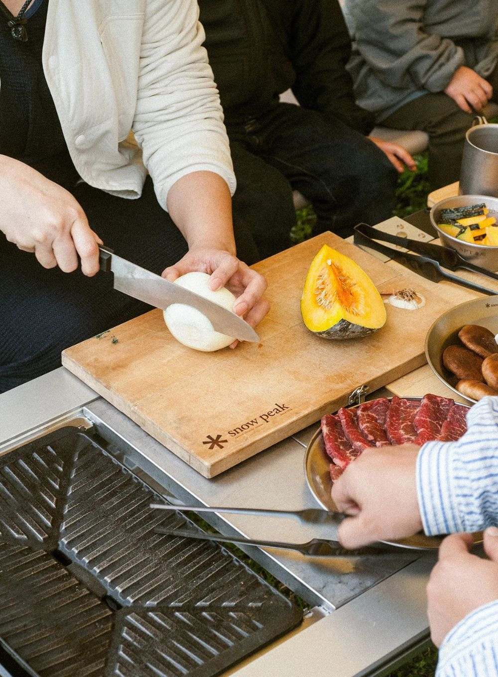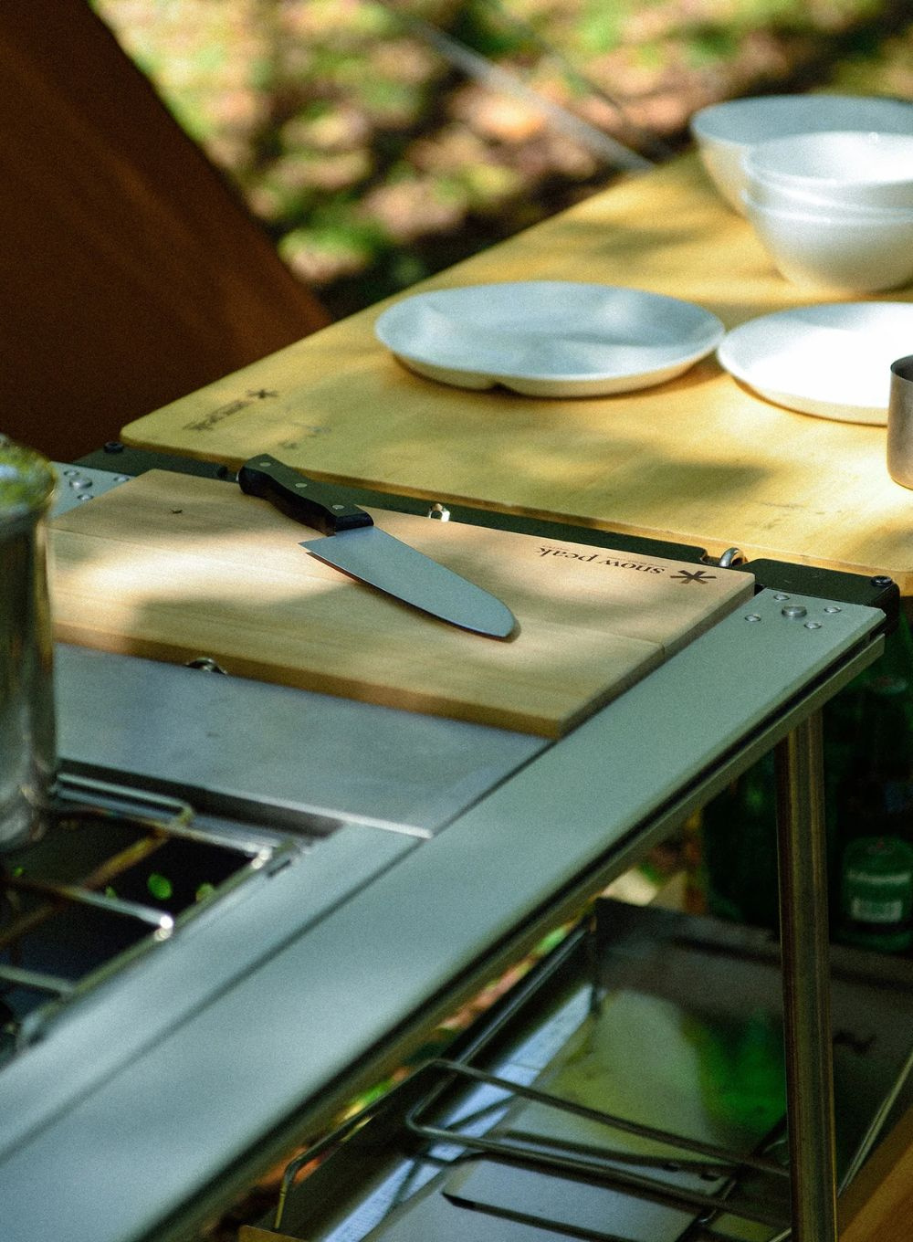 Zestaw turystyczny Snow Peak Chopping Board Set L został stworzony z myślą o gotowaniu na świeżym powietrzu. Składana deska z drewna brzozowego pełni funkcję etui, w którym bezpiecznie przechowywany jest pełnowymiarowy nóż szefa kuchni wykonany z wysokowęglowej stali wanadowej.