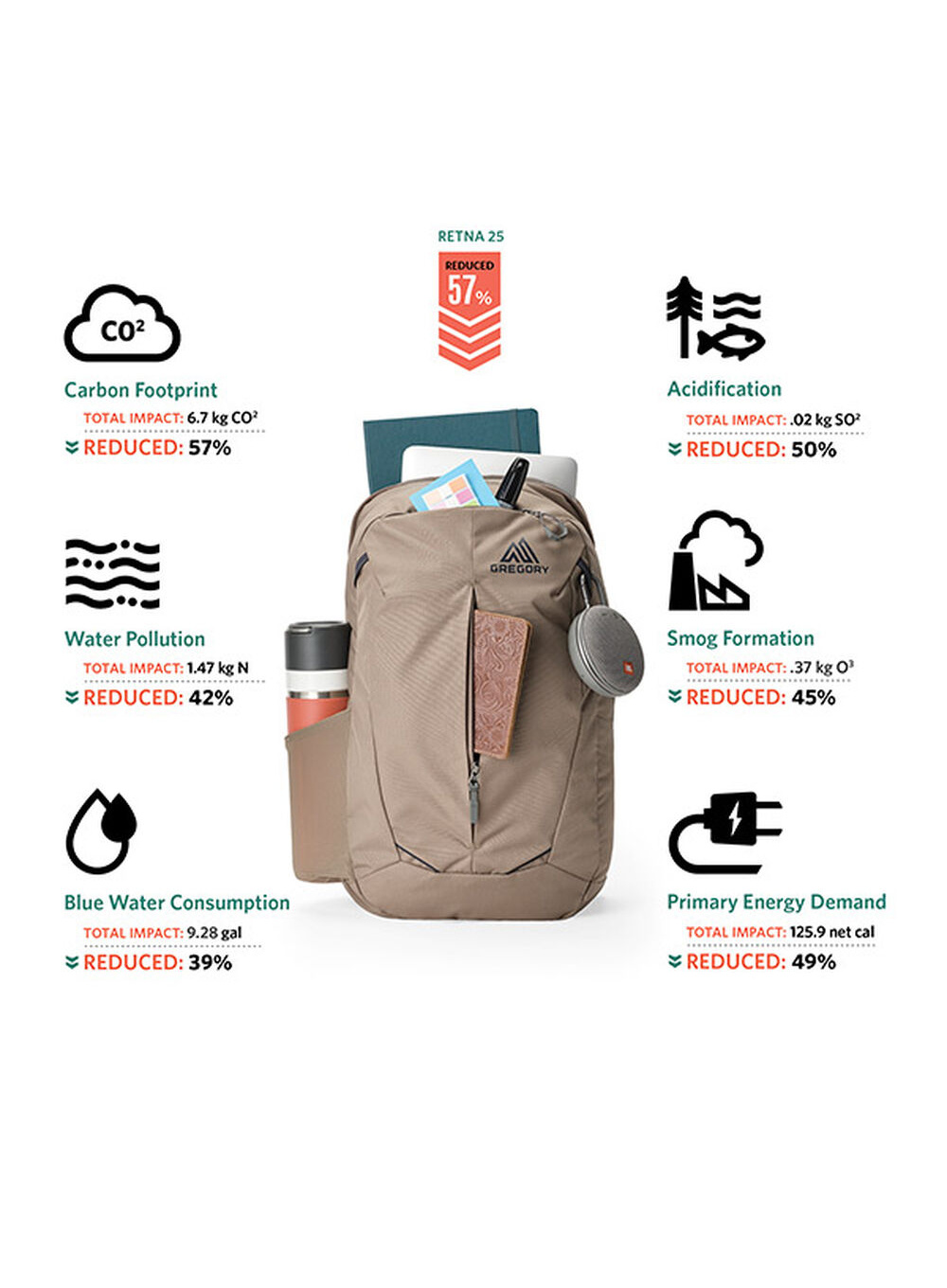 • Wszystkie materiały wykonane z materiałów pochodzących z recyklingu, co skutkuje 59% redukcją śladu węglowego w porównaniu do konwencjonalnego plecaka nylonowego