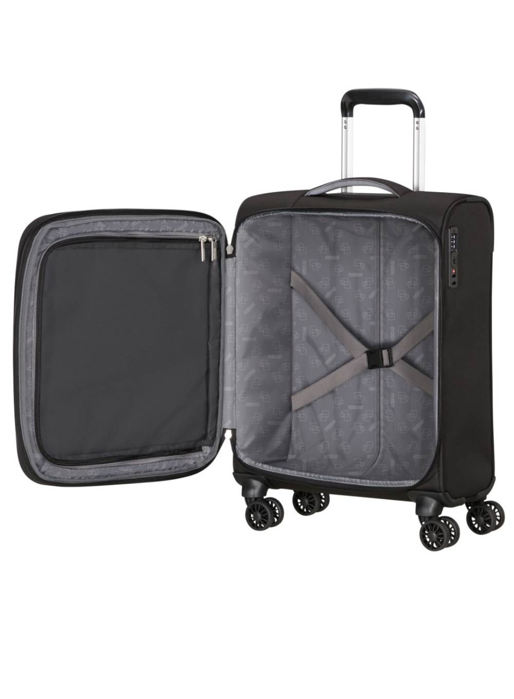 American Tourister Cloudrider S to lekka walizka kabinowa na 4 kółkach, zgodna z wymaganiami większości linii lotniczych. Oferuje możliwość poszerzenia, praktyczną organizację wnętrza i zamek TSA dla bezpieczeństwa.