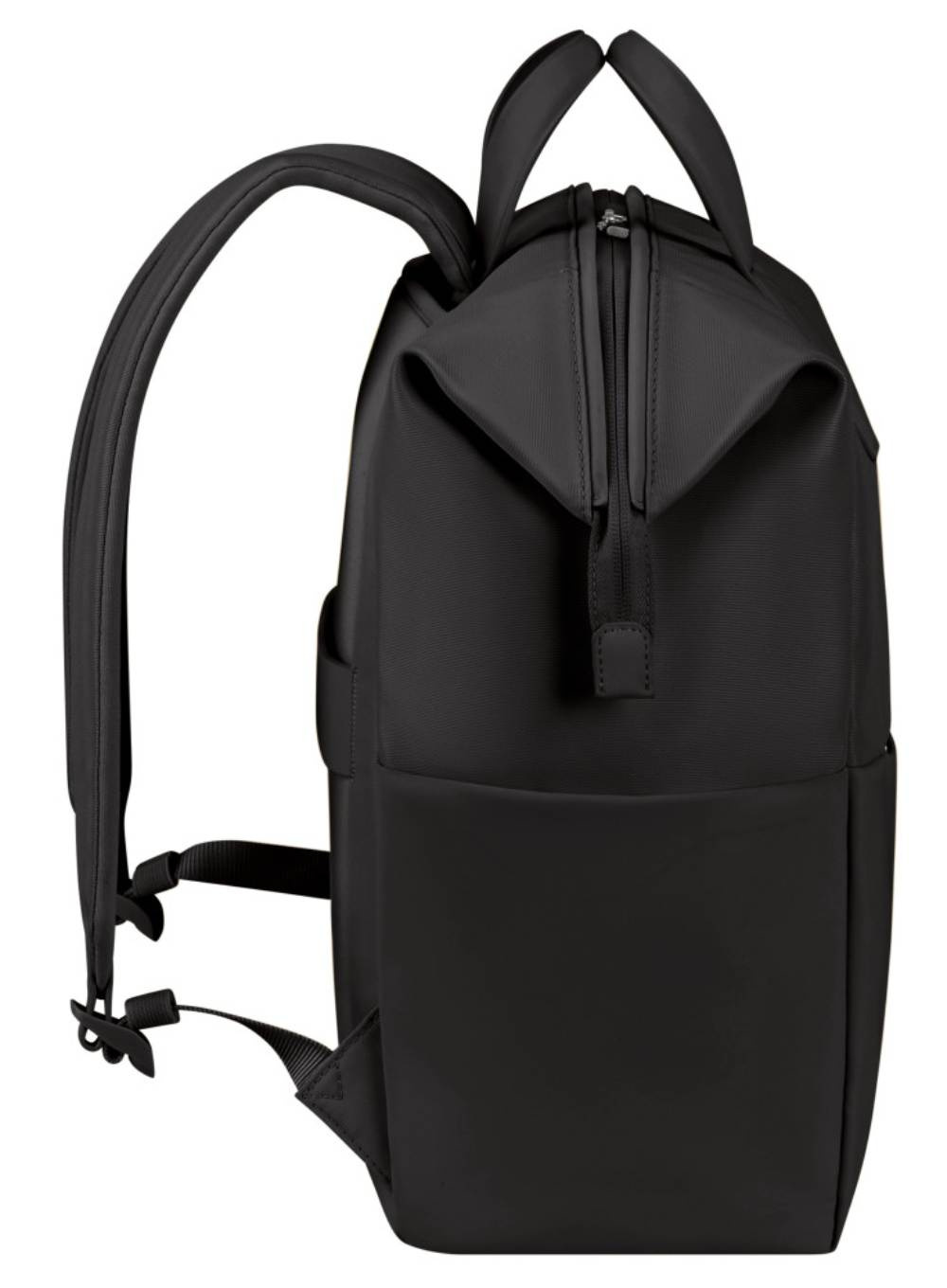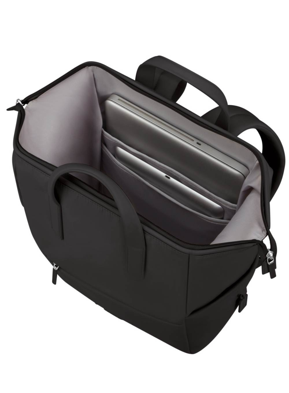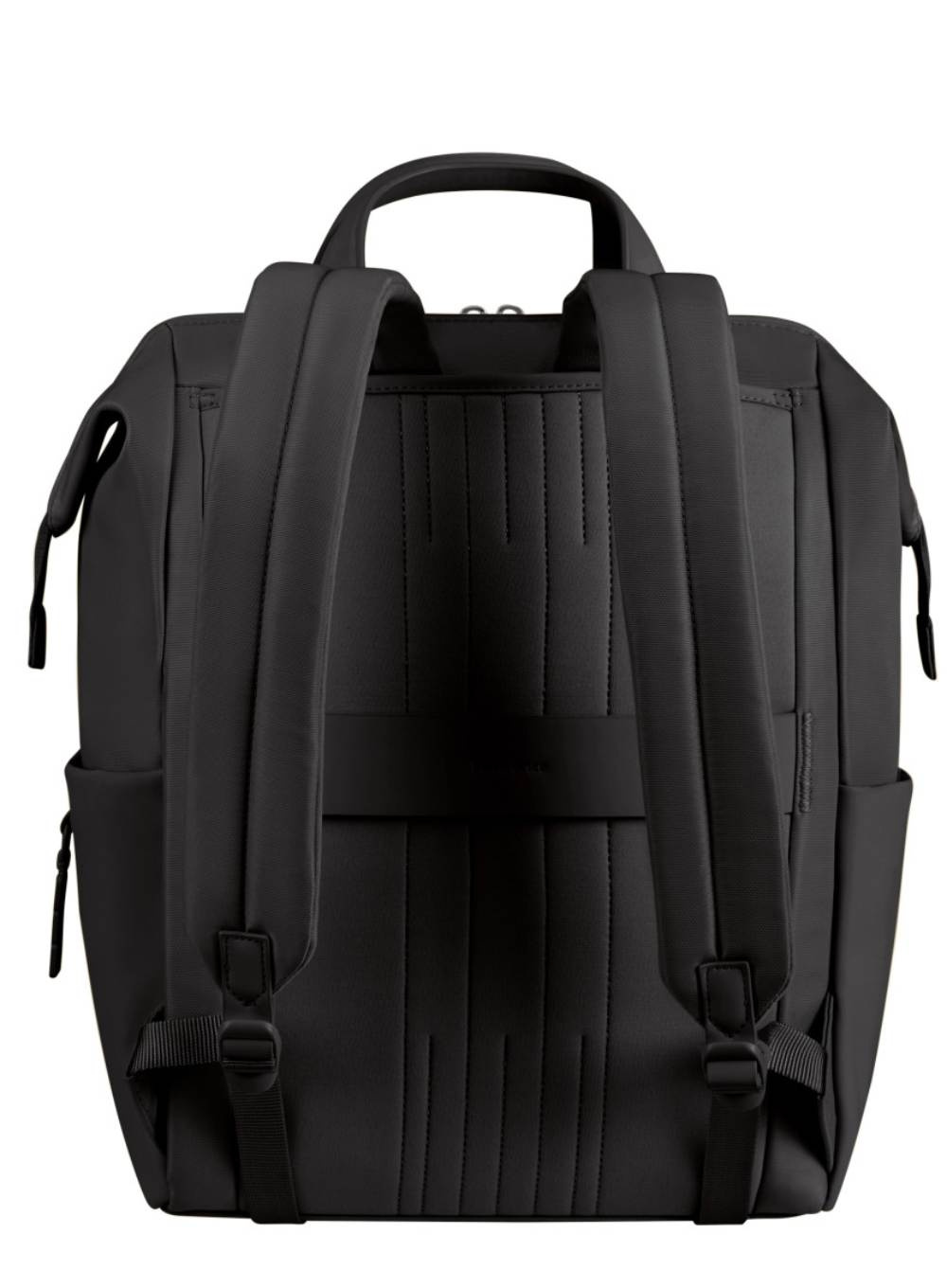 Dzięki szerokiemu otwarciu w metalowej ramie, inspirowanemu klasycznymi torbami lekarskimi, plecak gwarantuje łatwy dostęp do zawartości. Posiada dedykowane, wyściełane kieszenie na laptop 14,1" i tablet 10,5", a także dodatkowe przegródki na telefon, powerbank oraz akcesoria. Z zewnątrz oferuje pojemną kieszeń przednią, dwie otwarte boczne, chowaną kieszeń na butelkę oraz ukryty schowek z tyłu.