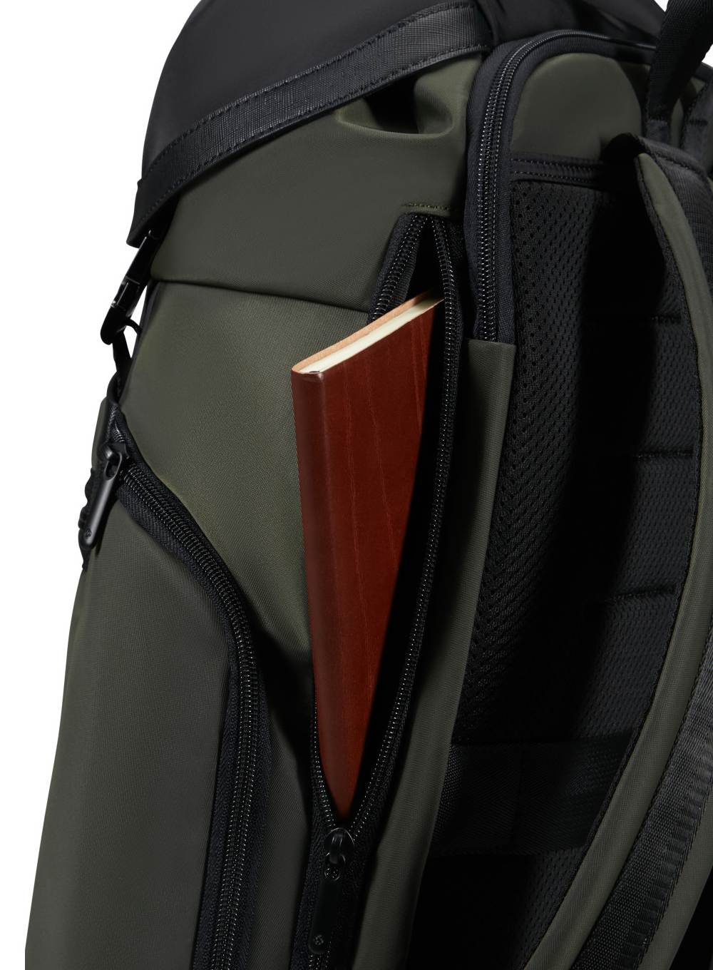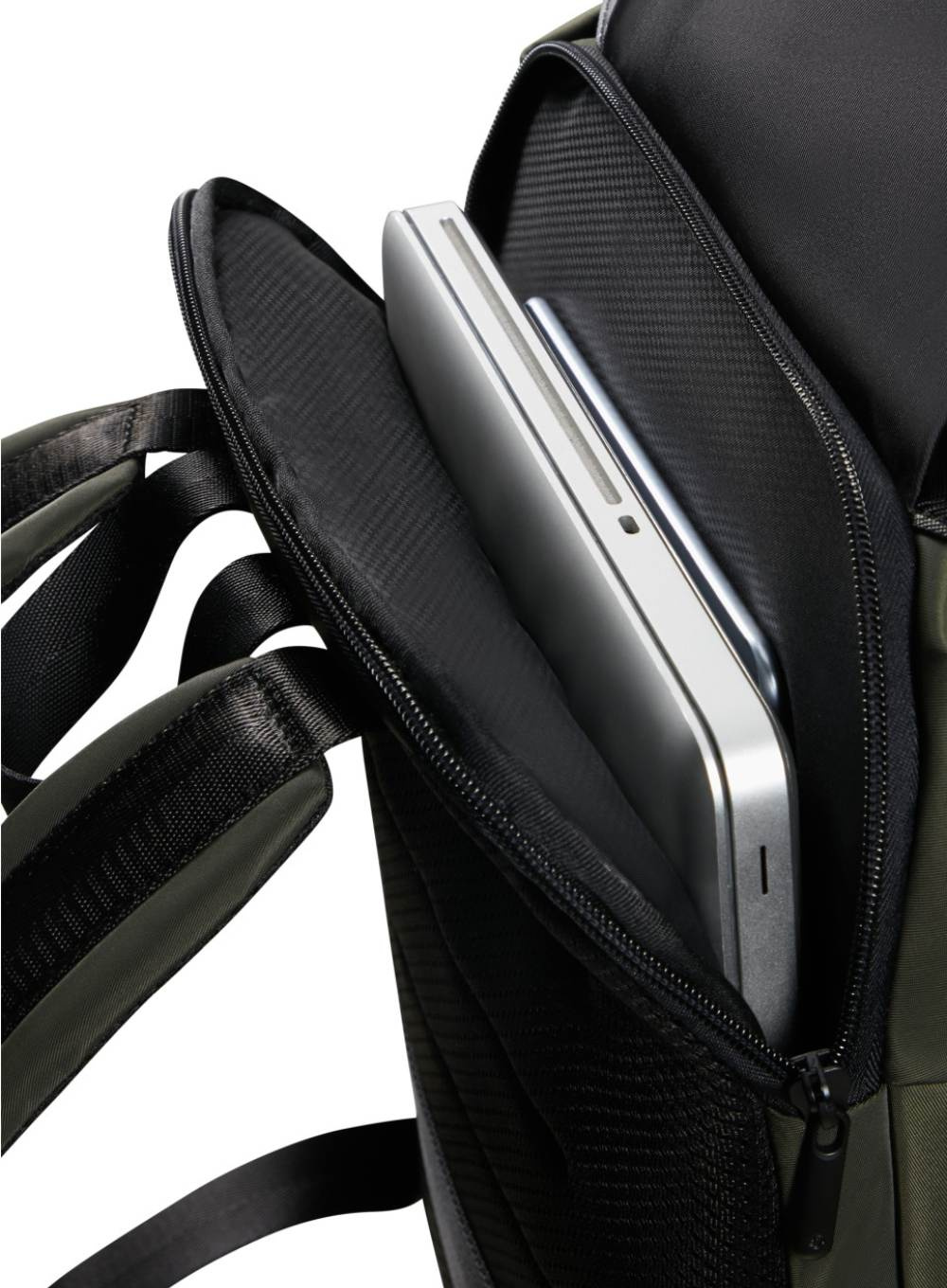 Hydrofobowa tkanina z recyklingu chroni zawartość, a ergonomiczne szelki i miękkie plecy gwarantują wygodę noszenia. Plecak można także zamocować na walizce dzięki tylnej pętli, co czyni go idealnym towarzyszem podróży służbowych.