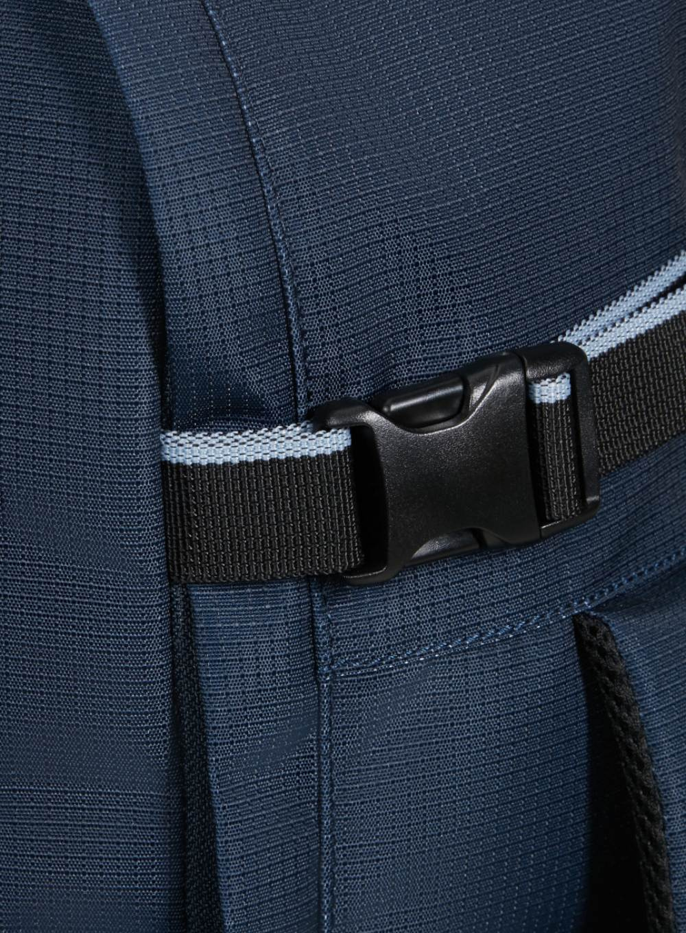 Plecak posiada wygodne pasy ramienne, wyściełany panel tylny i miękkie uchwyty do przenoszenia. Wykończony pasami kompresyjnymi do regulacji objętości na jednym z boków i pasem do mocowania na walizce lub torbie podróżnej. Zarówno wewnętrzna, jak i zewnętrzna tkanina są wykonane z przetworzonych butelek PET.