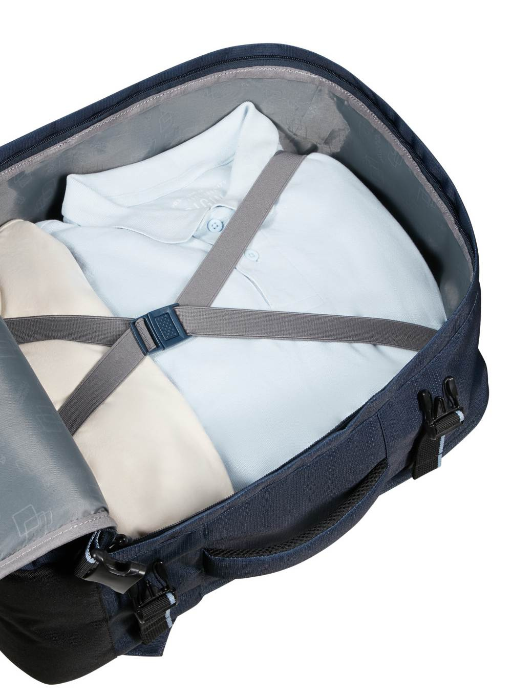 Pojemna komora główna na ubrania, w której znajdują się pasy mocujące pozwala zachować porządek. Z tyłu plecaka jest oddzielna komora dedykowana na laptop 15,6" i tablet. Przednia zasuwana kieszeń jest idealna na przedmioty wymagające szybkiego dostępu, a elastyczna kieszeń na jednym z boków umożliwia zabranie butelki lub parasola.