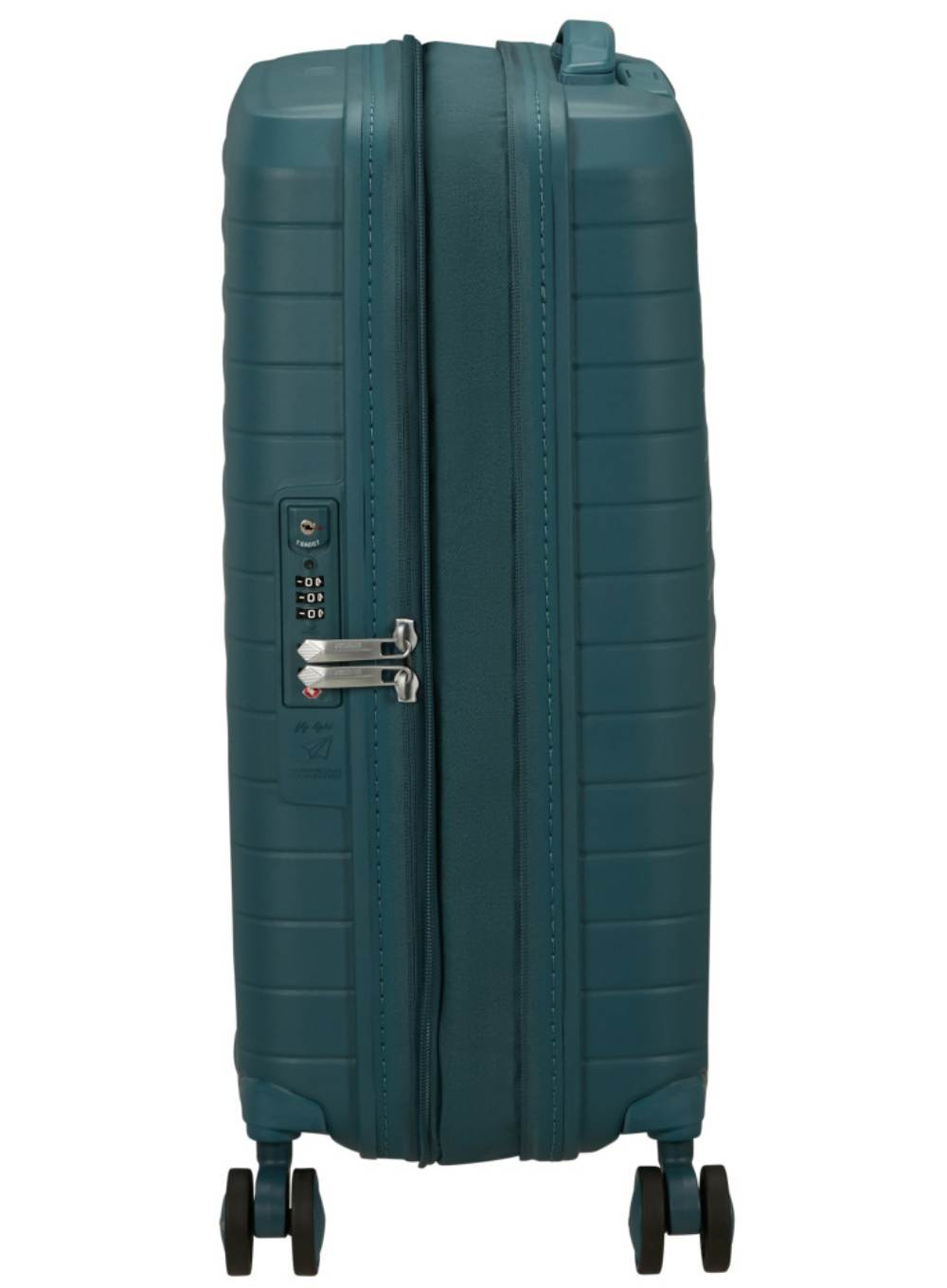 Dodatkowe udogodnienia to personalizacyjne naklejki, teleskopowa rączka, górny uchwyt oraz ochraniacze boczne chroniące walizkę przed otarciami. Wnętrze wykonano w 100% z tkaniny pochodzącej z recyklingu butelek PET.