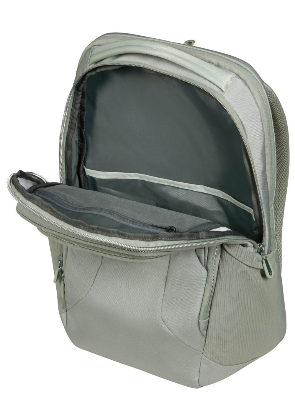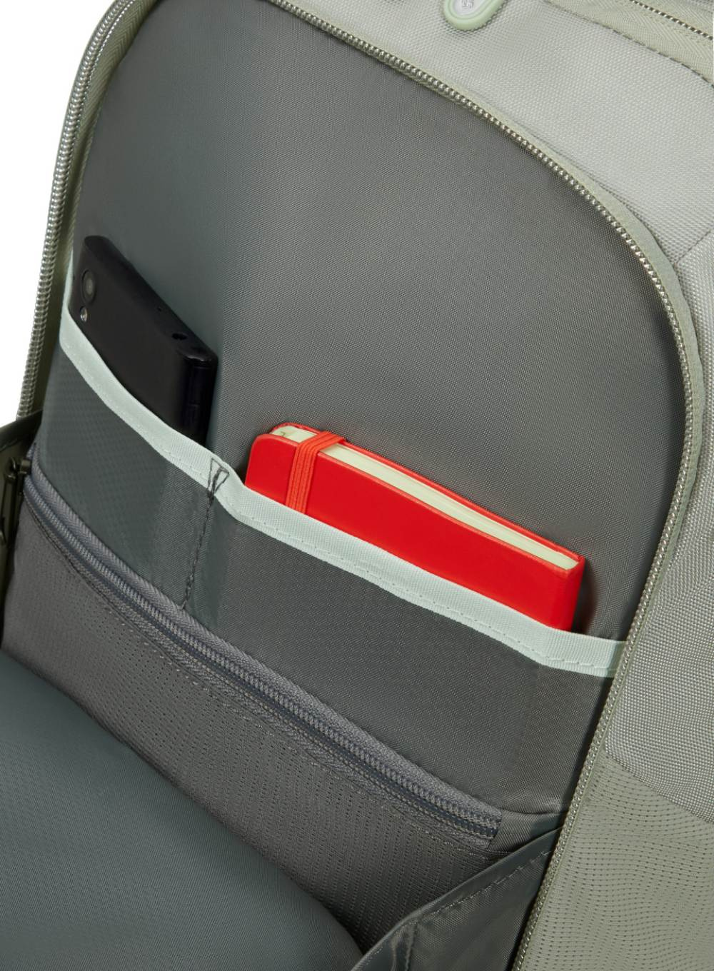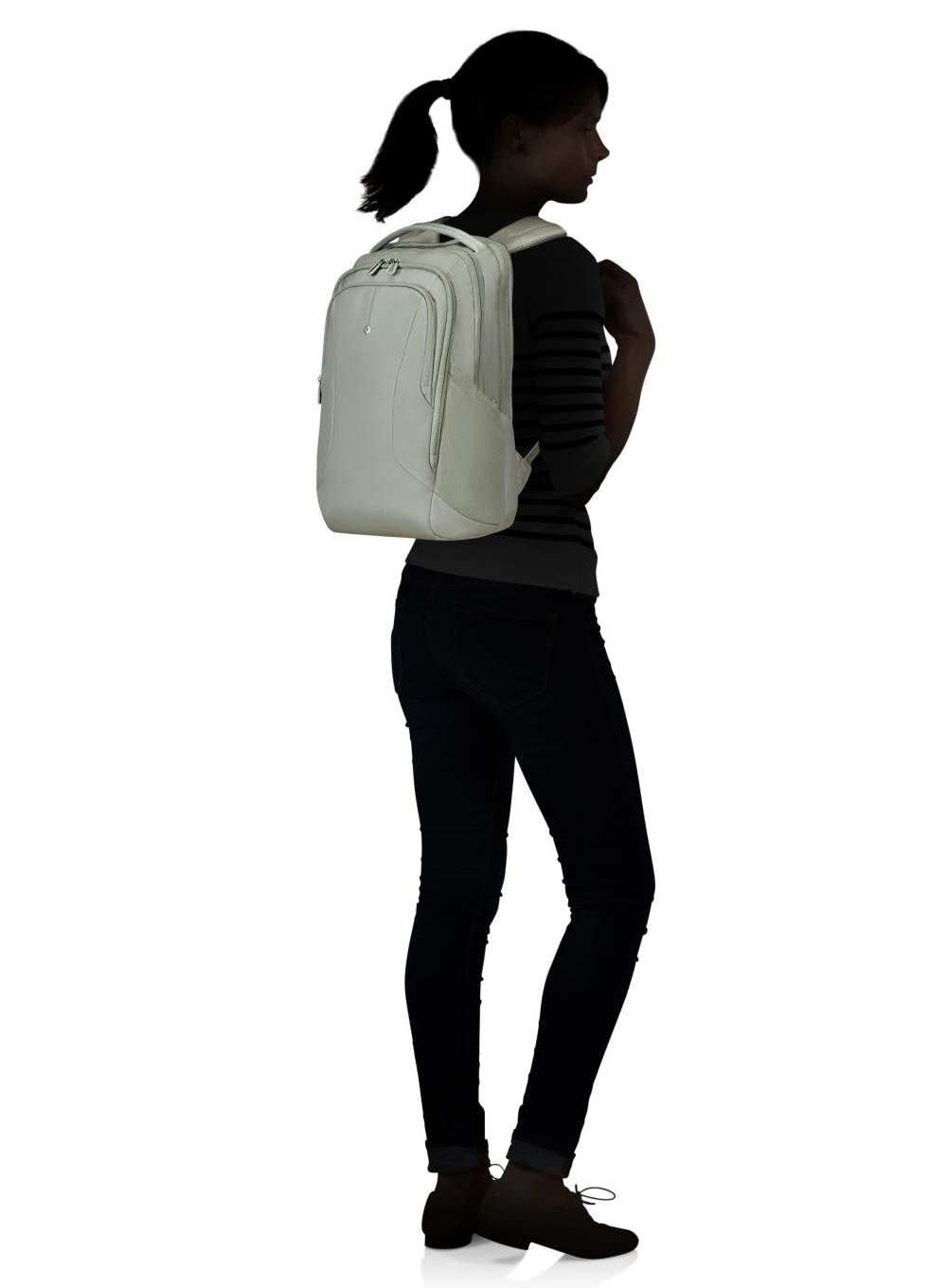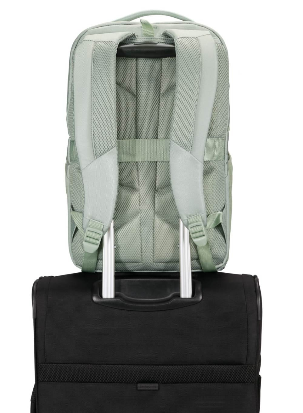 Ergonomiczne szelki, lekka konstrukcja oraz miękki panel tylny zapewniają komfort noszenia nawet podczas długich dni w ruchu. Poliester z recyklingu PET chroni zawartość, a pasek Smart Sleeve ułatwia transport z walizką.