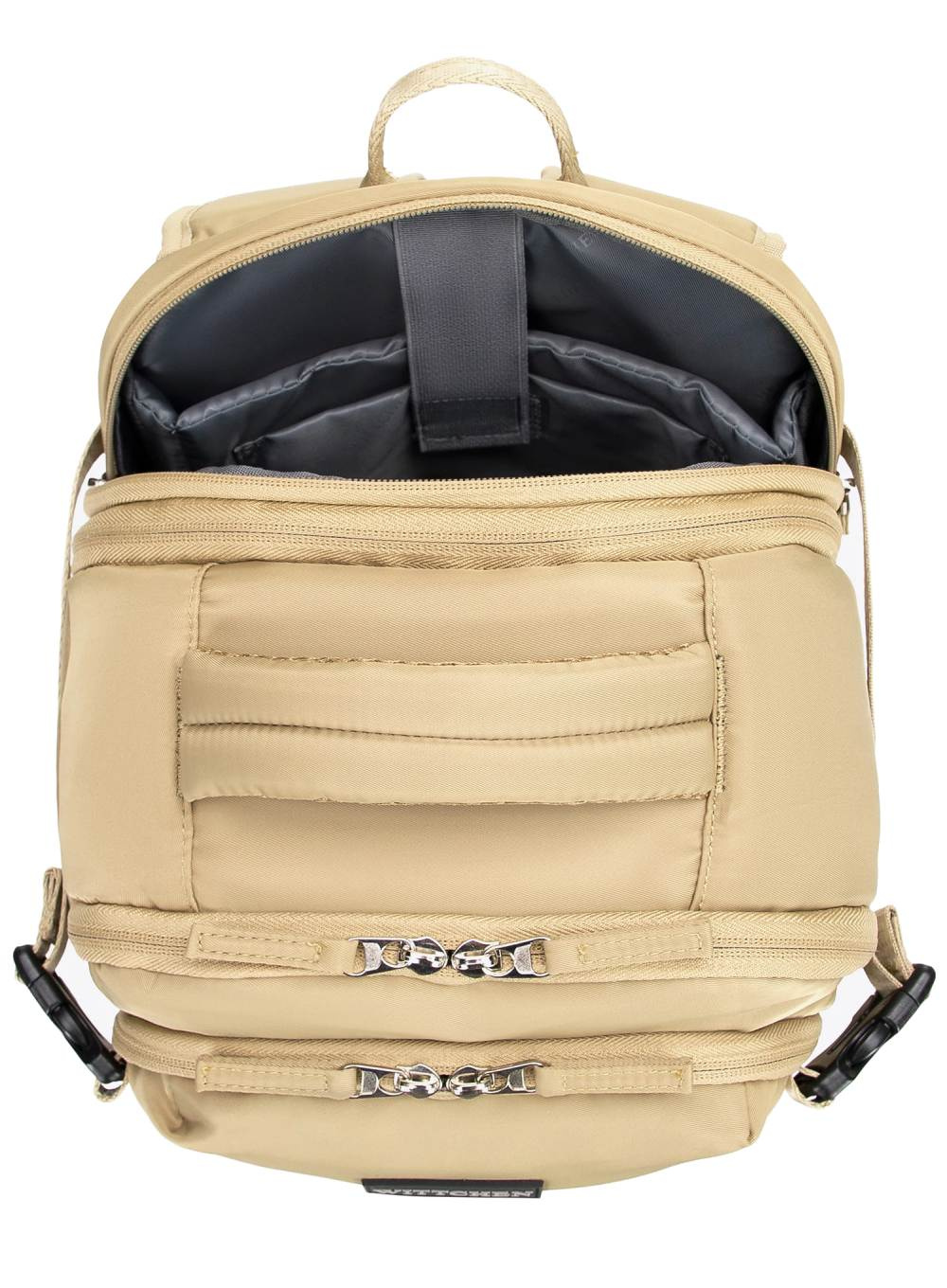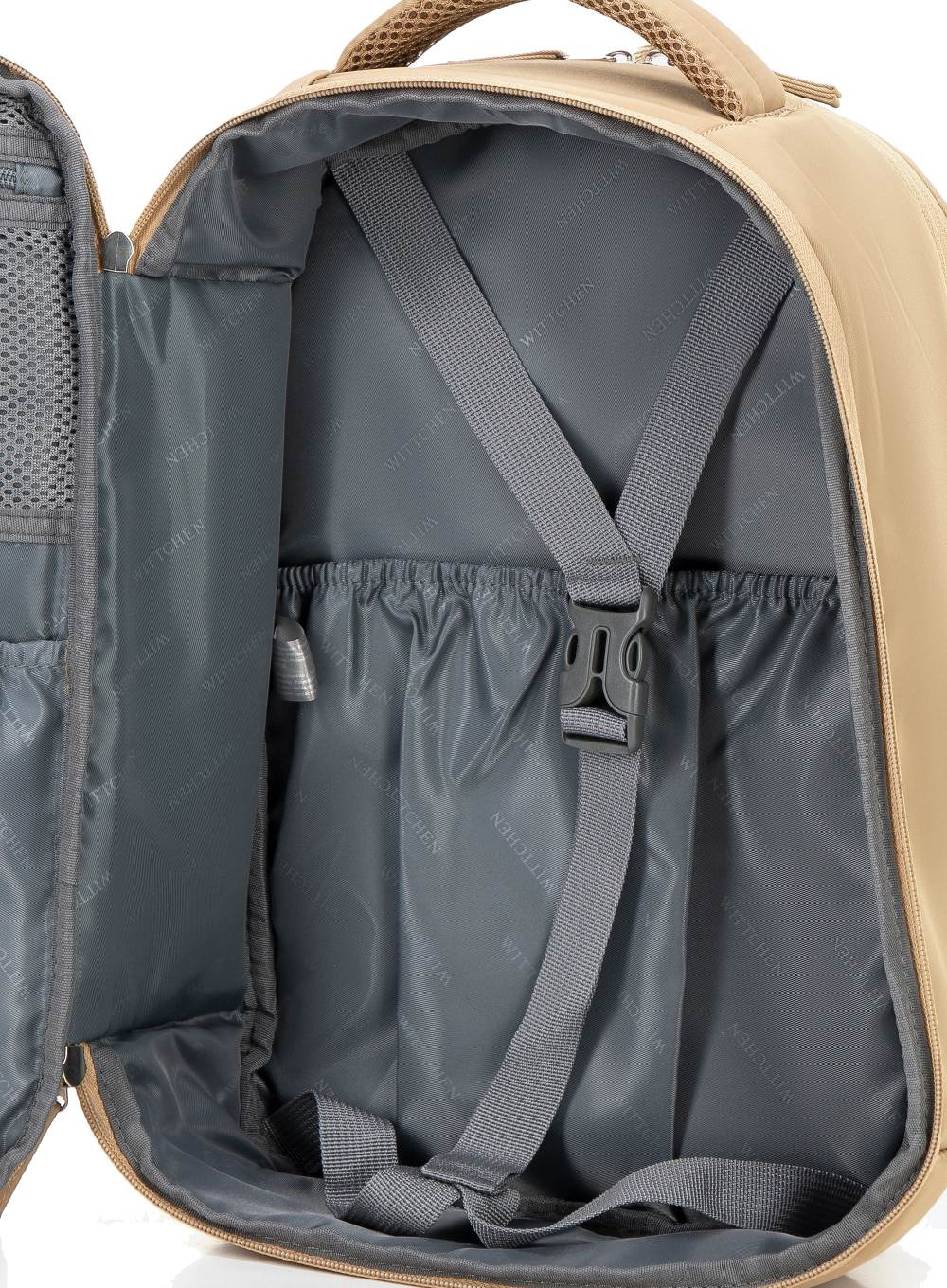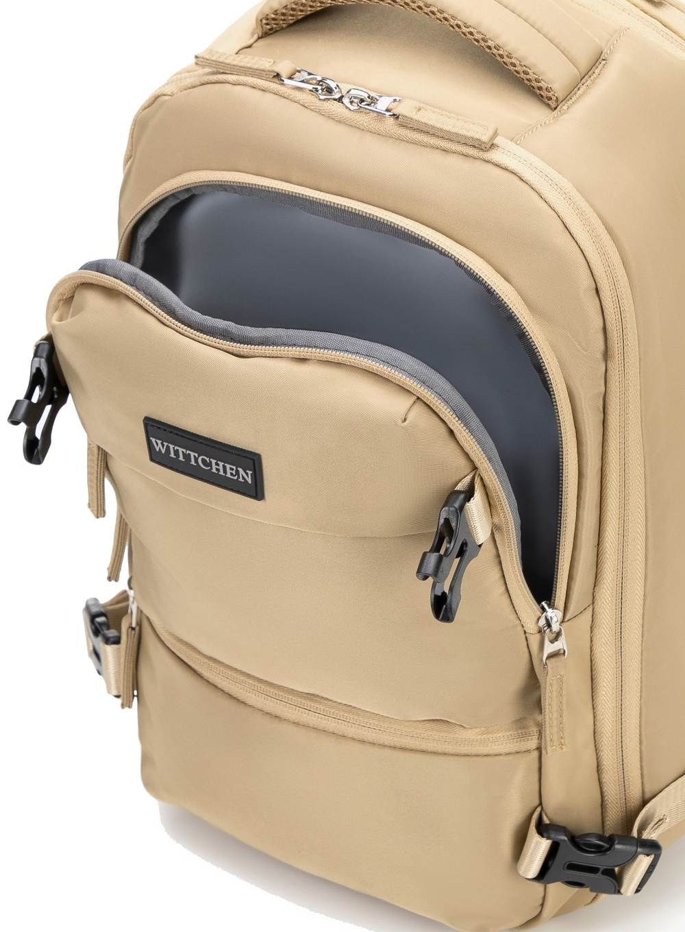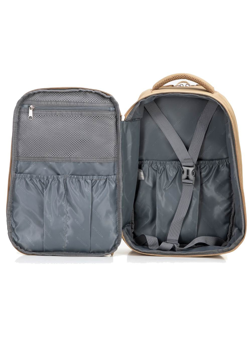 • Główna komora otwierana jak w walizce – z regulowanymi pasami, siatkową kieszenią i dodatkowymi przegródkami