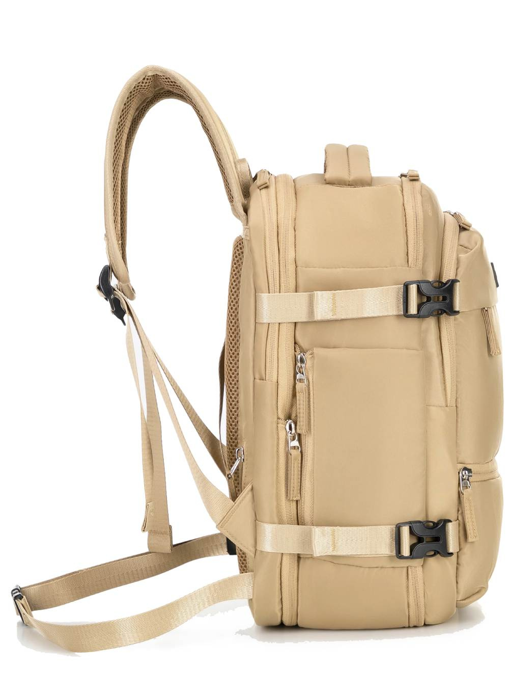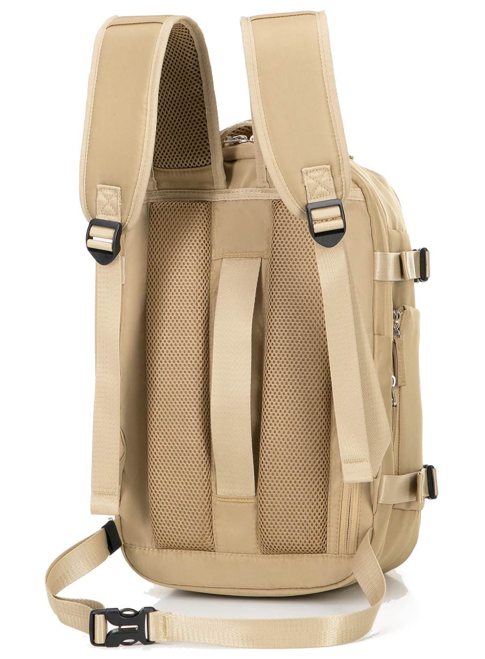 Komfort noszenia zapewniają wyściełane, regulowane szelki oraz pas biodrowy, który odciąża plecy podczas dłuższych podróży. Plecak został wyposażony także w pionowy uchwyt do mocowania na walizce oraz liczne kieszenie zewnętrzne – w tym ukrytą kieszeń na dokumenty i rozszerzaną kieszeń boczną na butelkę lub parasol. To idealny wybór dla osób podróżujących samolotem, ceniących wygodę i doskonałą organizację.