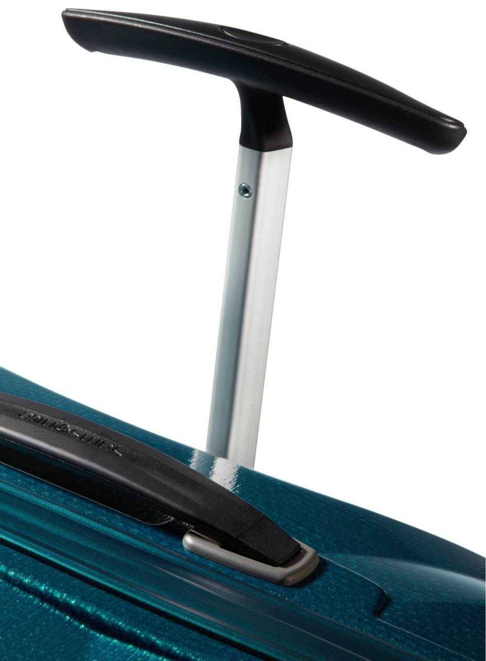 Mała walizka Samsonite Lite Shock Curv porusza się łatwo i wygodnie dzięki regulowanemu uchwytowi i 4 wielokierunkowym kółkom. Z boku i na górze znajdują się również 2 uchwyty do przenoszenia.