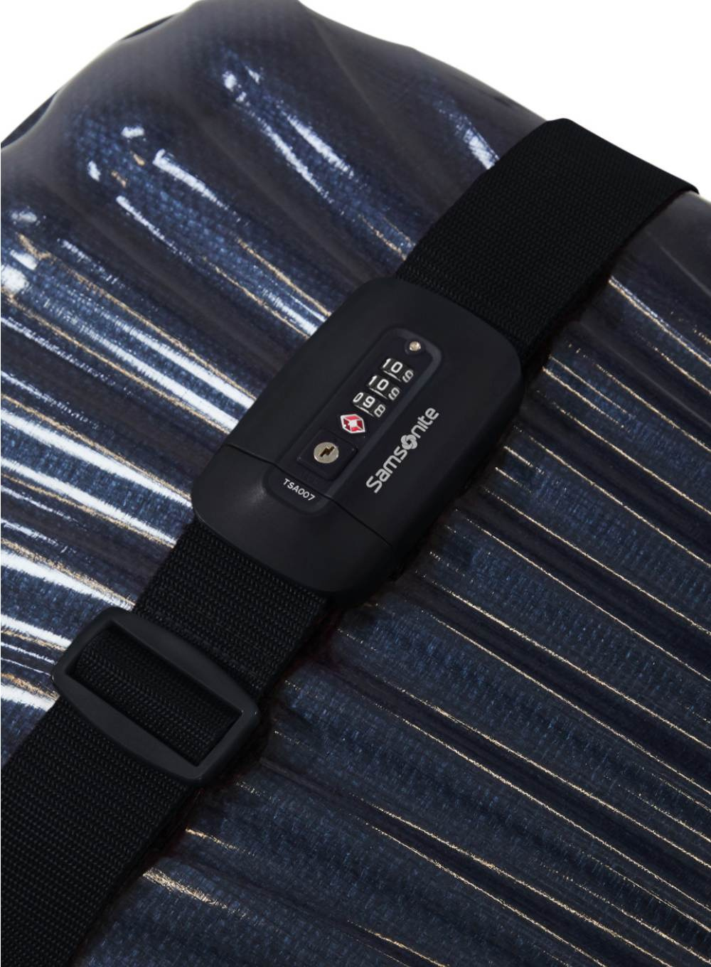 Samsonite Ta Revolution Luggage Strap/TSA Lock zwiększa bezpieczeństwo bagażu i ułatwia jego identyfikację dzięki regulowanemu paskowi i zamkowi TSA z potrójnym szyfrem.