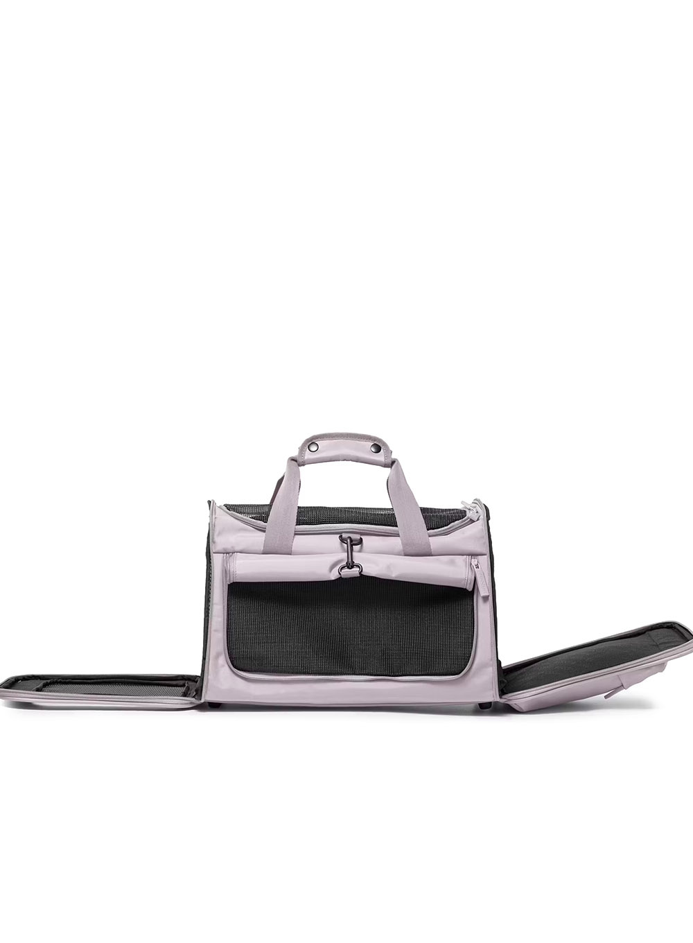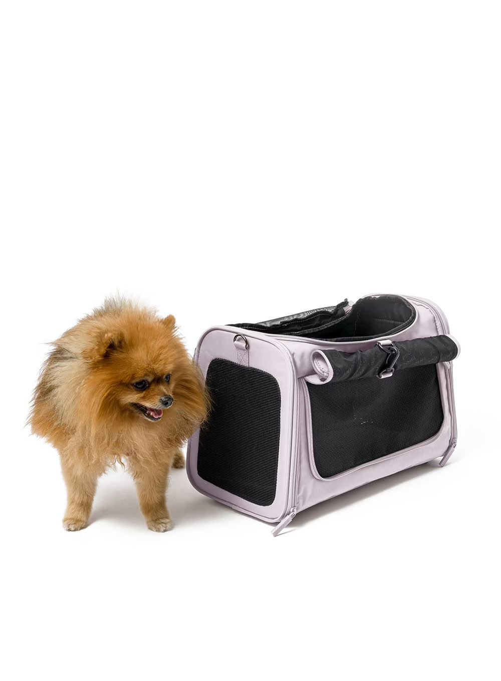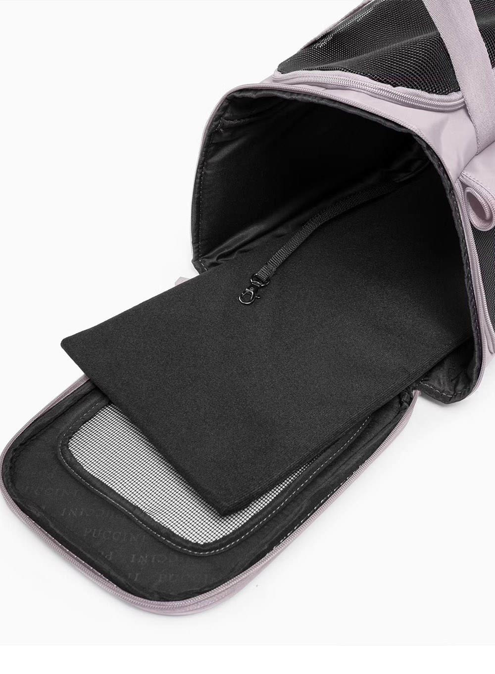 Wnętrze transportera wyposażono w pasek z karabińczykiem do przypięcia obroży lub szelek, a także wyciąganą, łatwą w czyszczeniu matę. Torba posiada dwa poręczne uchwyty oraz regulowany, odpinany pasek, co pozwala nosić ją w dłoni lub na ramieniu. Elastyczny pas z tyłu umożliwia przymocowanie transportera do stelaża walizki, co ułatwia podróżowanie. Dodatkowa zewnętrzna kieszeń na zamek doskonale sprawdzi się do przechowywania drobiazgów i akcesoriów zwierzęcia.
