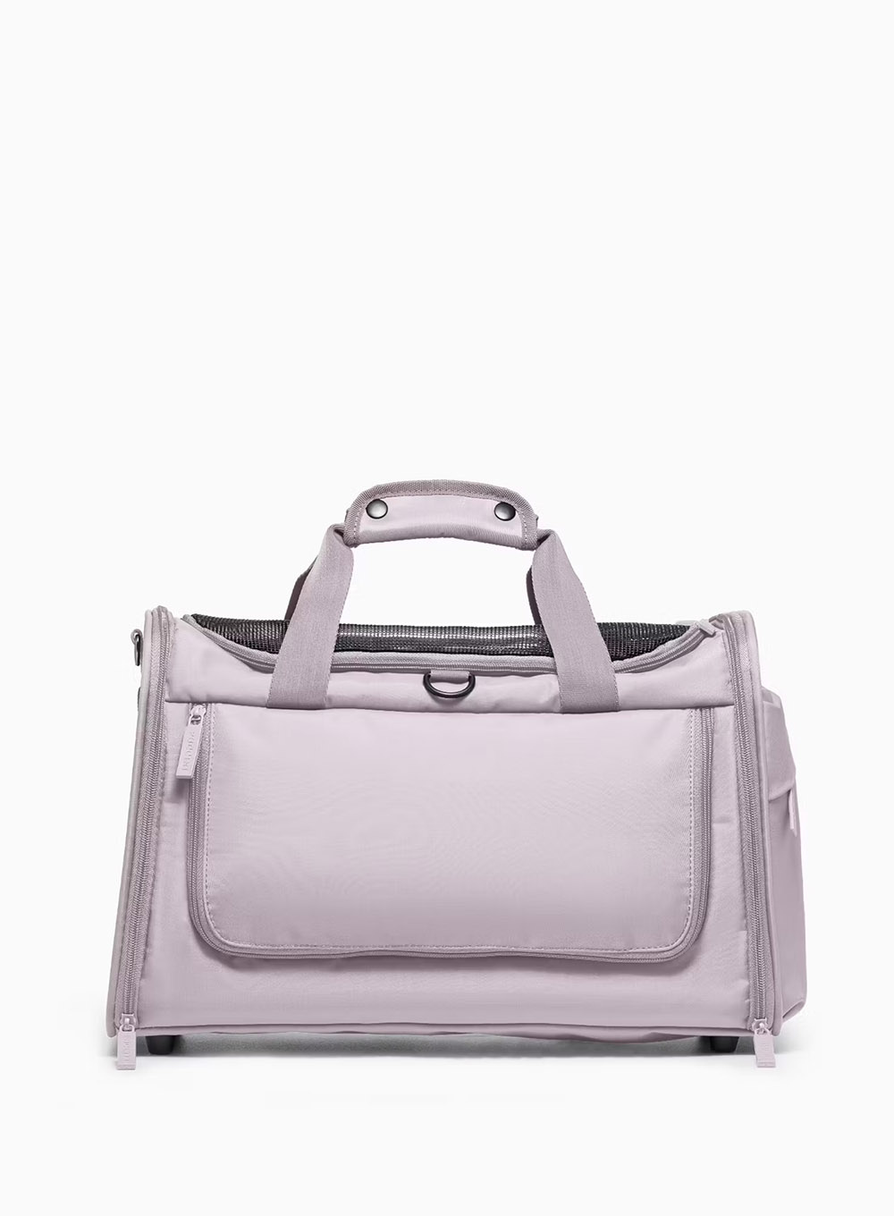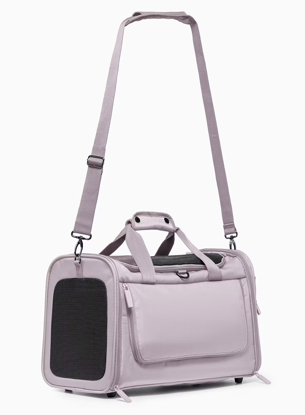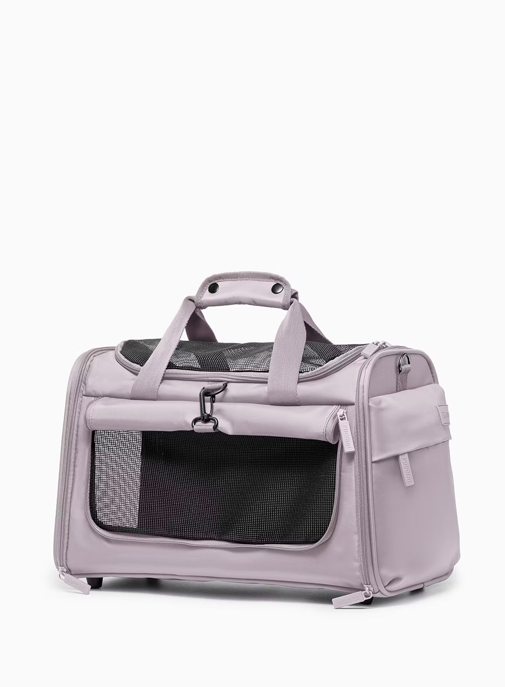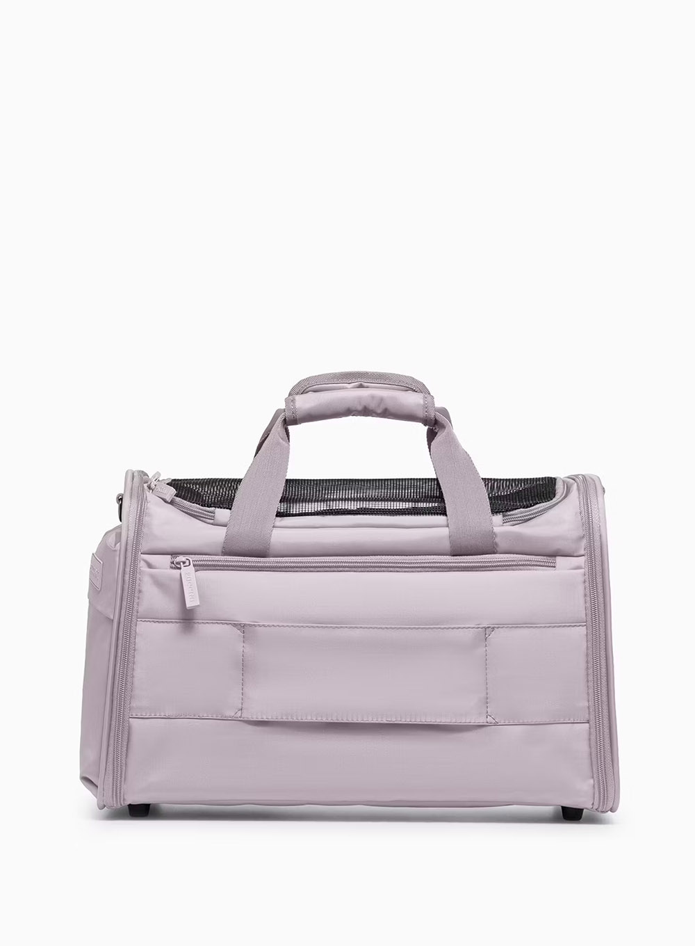 Wnętrze transportera wyposażono w pasek z karabińczykiem do przypięcia obroży lub szelek, a także wyciąganą, łatwą w czyszczeniu matę. Torba posiada dwa poręczne uchwyty oraz regulowany, odpinany pasek, co pozwala nosić ją w dłoni lub na ramieniu. Elastyczny pas z tyłu umożliwia przymocowanie transportera do stelaża walizki, co ułatwia podróżowanie. Dodatkowa zewnętrzna kieszeń na zamek doskonale sprawdzi się do przechowywania drobiazgów i akcesoriów zwierzęcia.