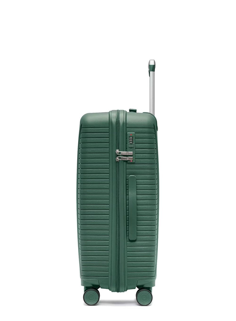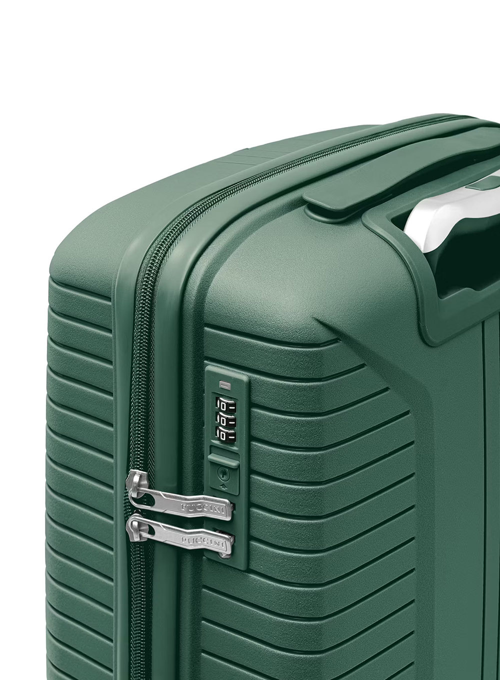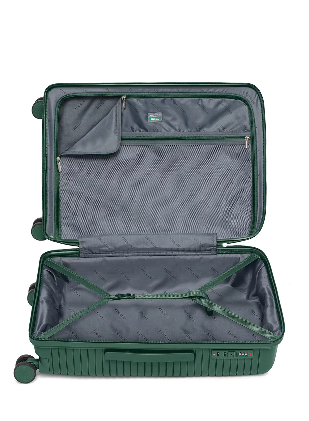Walizka średnia Puccini Berlin wykonana została z trwałego polipropylenu, materiału o wysokiej odporności na wgniecenia, zarysowania i uszkodzenia mechaniczne. Posiada dwie pojemne komory z doskonale zorganizowanym wnętrzem – jedna z nich zamykana jest materiałową przegrodą na zamek z dużą kieszenią z siatki, a druga wyposażona jest w elastyczne pasy zabezpieczające bagaż przed przemieszczaniem się. Wbudowany zamek szyfrowy chroni zawartość przed dostępem osób niepowołanych, zapewniając pełne bezpieczeństwo podczas podróży.