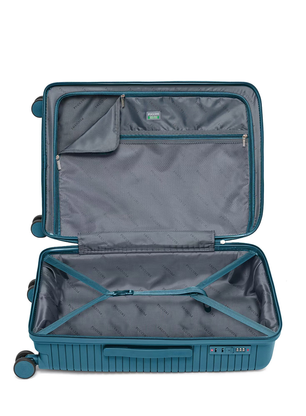 Walizka średnia Puccini Berlin wykonana została z trwałego polipropylenu, materiału o wysokiej odporności na wgniecenia, zarysowania i uszkodzenia mechaniczne. Posiada dwie pojemne komory z doskonale zorganizowanym wnętrzem – jedna z nich zamykana jest materiałową przegrodą na zamek z dużą kieszenią z siatki, a druga wyposażona jest w elastyczne pasy zabezpieczające bagaż przed przemieszczaniem się. Wbudowany zamek szyfrowy chroni zawartość przed dostępem osób niepowołanych, zapewniając pełne bezpieczeństwo podczas podróży.