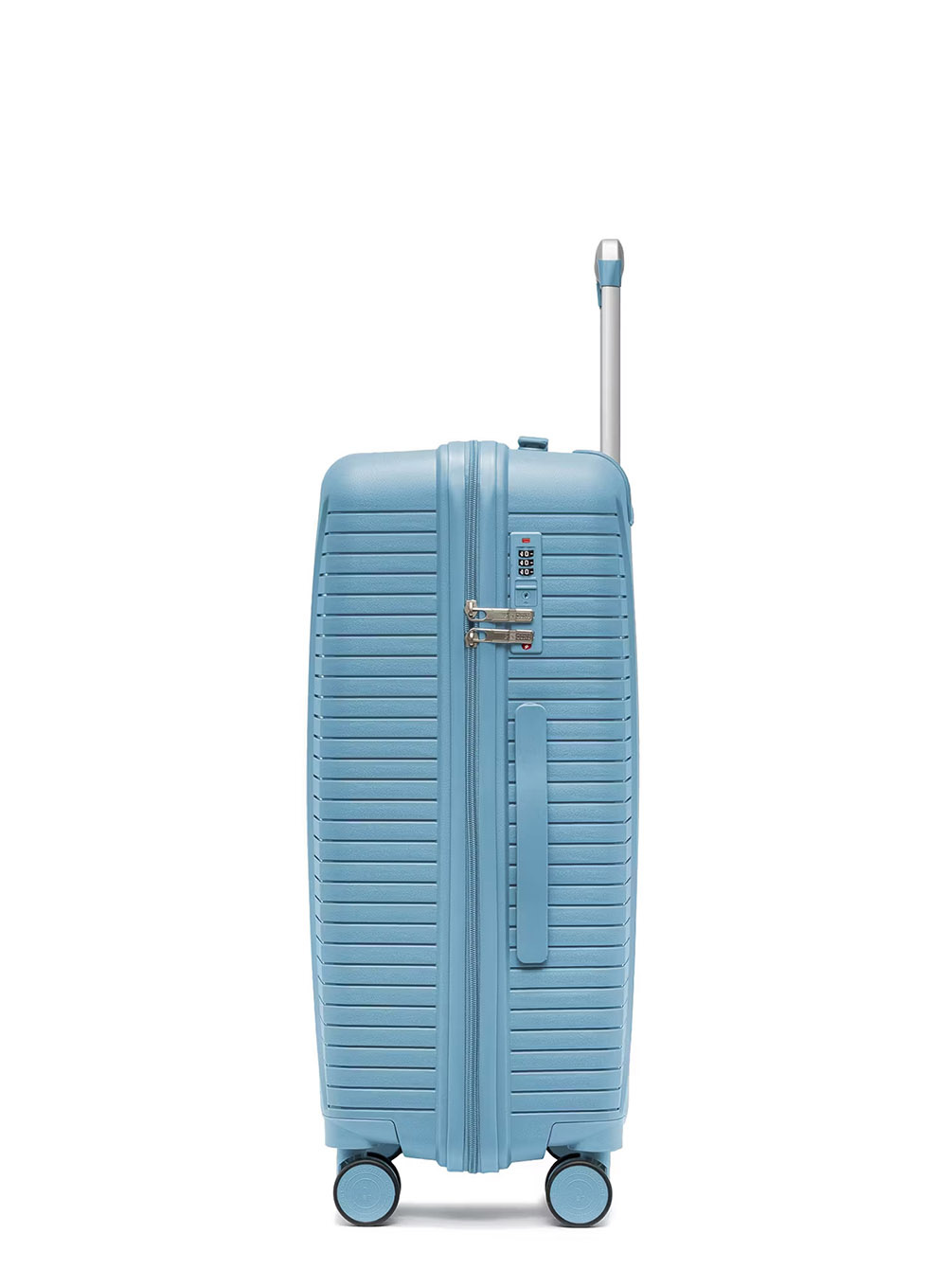 Walizka średnia Puccini Berlin wykonana została z trwałego polipropylenu, materiału o wysokiej odporności na wgniecenia, zarysowania i uszkodzenia mechaniczne. Posiada dwie pojemne komory z doskonale zorganizowanym wnętrzem – jedna z nich zamykana jest materiałową przegrodą na zamek z dużą kieszenią z siatki, a druga wyposażona jest w elastyczne pasy zabezpieczające bagaż przed przemieszczaniem się. Wbudowany zamek szyfrowy chroni zawartość przed dostępem osób niepowołanych, zapewniając pełne bezpieczeństwo podczas podróży.