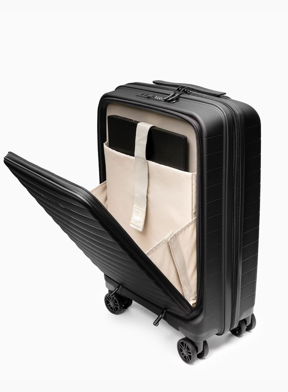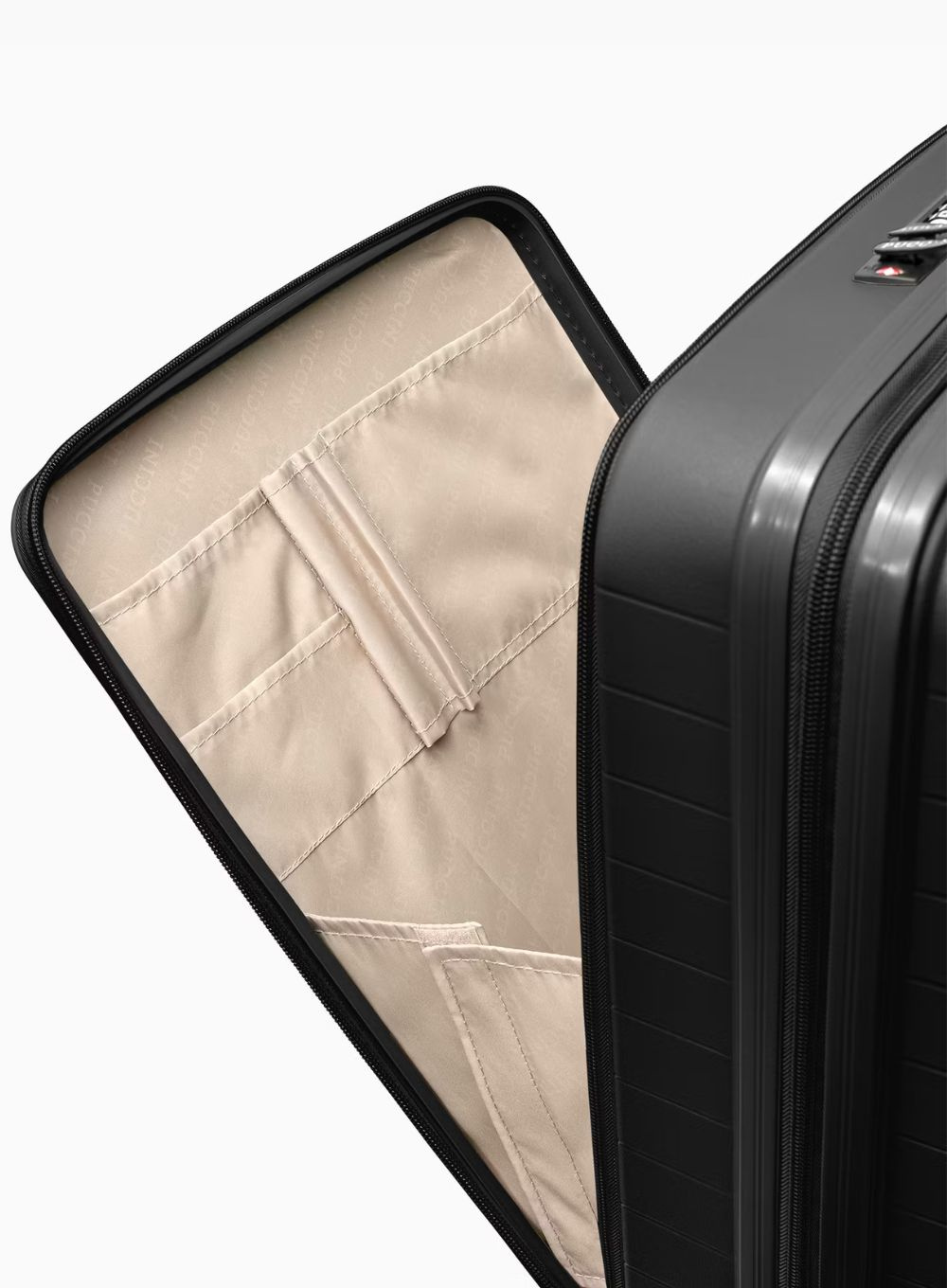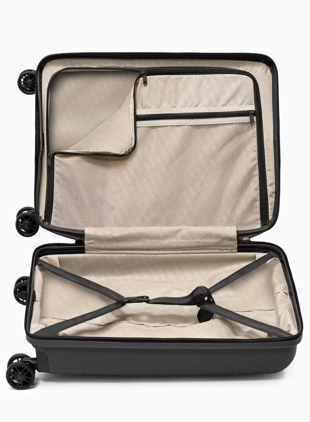 Wnętrze walizki zostało zaprojektowane z myślą o maksymalnej funkcjonalności. Posiada dwie komory – jedną zamykaną przegrodą na suwak z kieszenią z siatki oraz drugą z elastycznymi pasami zabezpieczającymi zawartość przed przemieszczaniem. Dwa zamki szyfrowe TSA zapewniają wysoki poziom ochrony przed dostępem osób niepowołanych, jednocześnie umożliwiając bezpieczne kontrole lotniskowe bez ryzyka uszkodzenia bagażu.