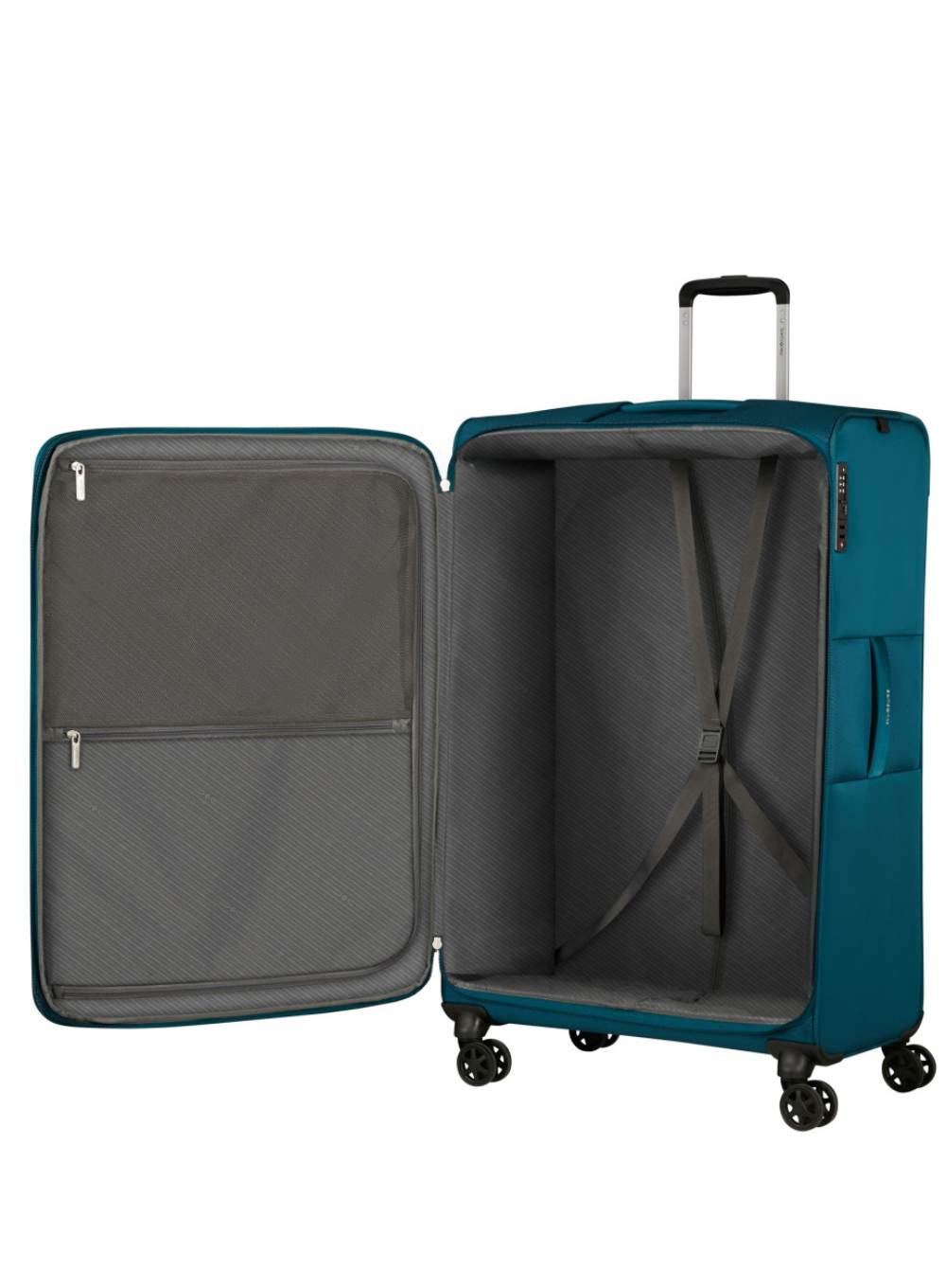 Walizka duża poszerzana Samsonite Base Breeze to propozycja dla osób poszukujących niezawodnego bagażu o nowoczesnym wyglądzie. Wykonana z lekkiego, wytrzymałego materiału typu softside, oferuje dużą pojemność i możliwość rozszerzenia, co czyni ją idealną na dłuższe wyjazdy i podróże rodzinne. Wnętrze walizki wykończono w 97% podszewką z recyklingowanego plastiku PET, co podkreśla jej ekologiczny charakter.