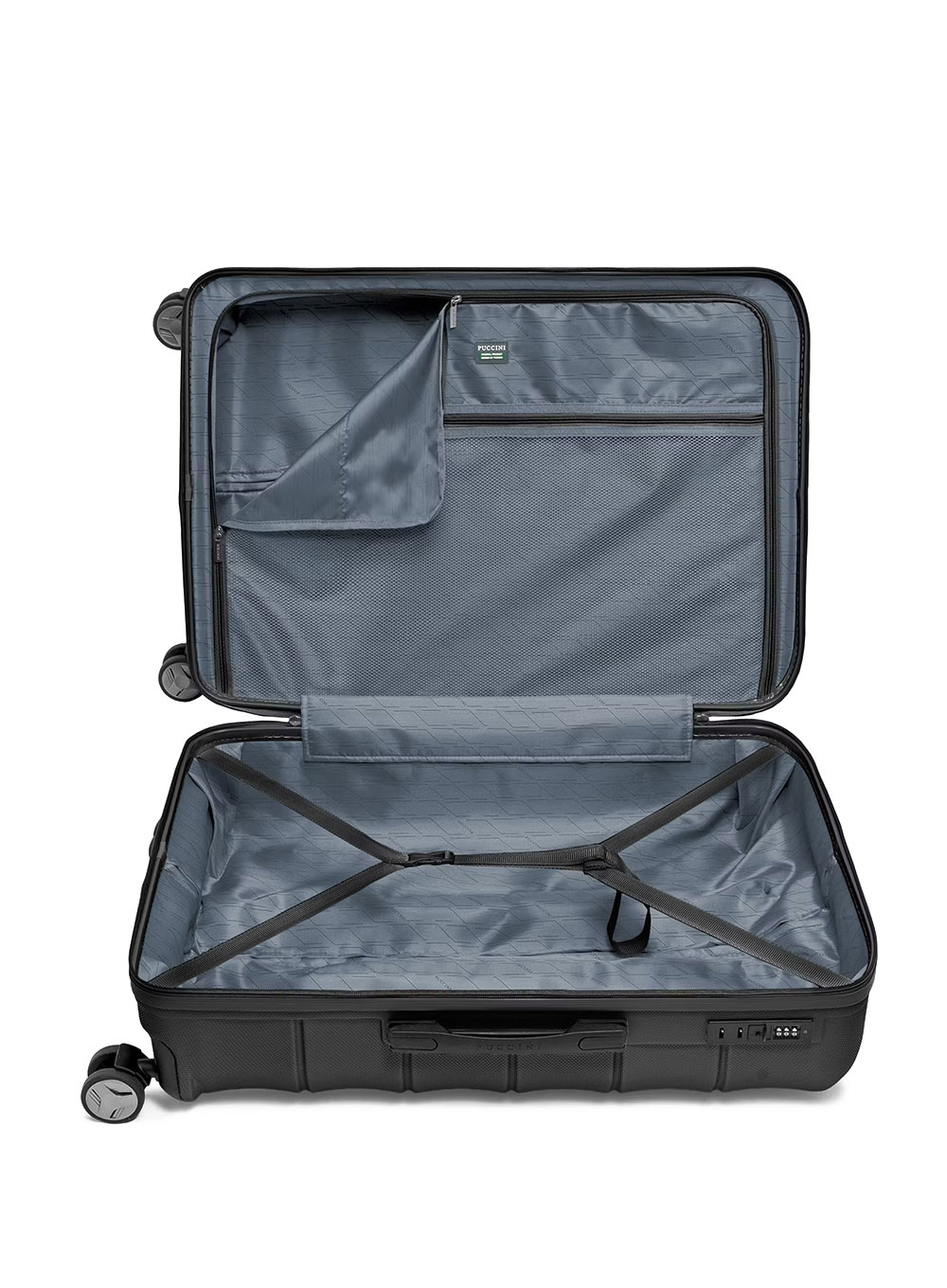 Walizka duża Puccini Cairo została zaprojektowana z myślą o wymagających podróżnikach, którzy szukają niezawodnego bagażu w eleganckim wydaniu. Wykonana z wysokiej jakości tworzywa ABS, wyróżnia się odpornością na uszkodzenia i ponadczasowym designem. Model posiada dwie przestronne komory – jedną zamykaną na suwak z dużą kieszenią z siatki oraz drugą z elastycznymi pasami zabezpieczającymi garderobę przed przemieszczaniem.