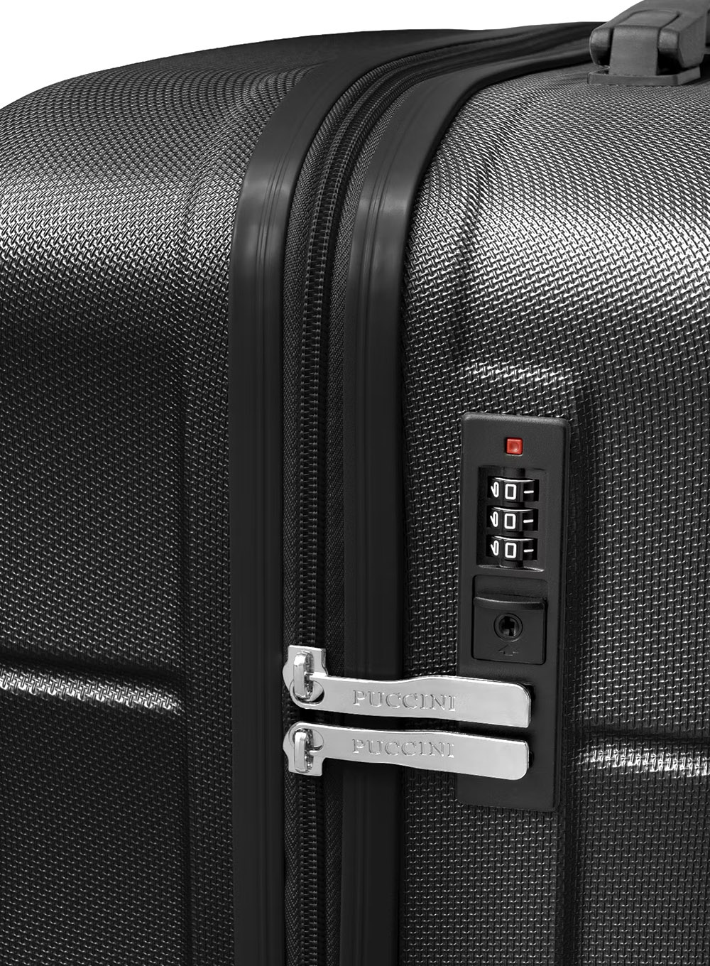 Bezpieczeństwo zawartości zapewnia zamek szyfrowy z możliwością ustawienia indywidualnego kodu. Dzięki czterem obrotowym kółkom 360°, walizka porusza się płynnie i lekko po każdej nawierzchni. Regulowana teleskopowa rączka umożliwia dopasowanie wysokości uchwytu do potrzeb użytkownika, co dodatkowo zwiększa komfort użytkowania. Kolekcja Puccini Cairo oferuje trzy rozmiary walizek – dużą, średnią i kabinową – w pięciu wariantach kolorystycznych: klasycznej czerni, granacie, bordo oraz nowoczesnych odcieniach rose gold i złotym.
