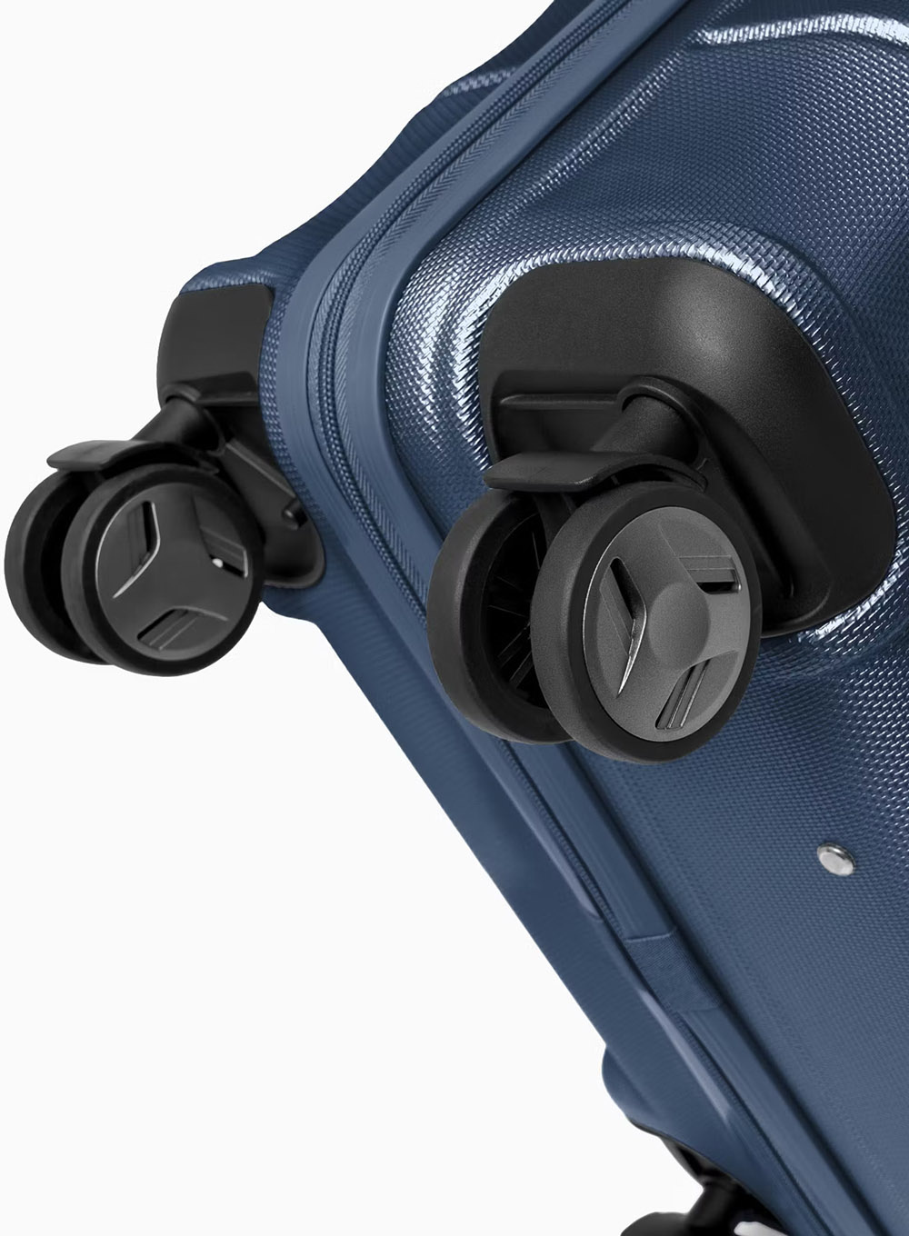 Zamek szyfrowy umożliwia łatwe ustawienie indywidualnego kodu, skutecznie chroniąc zawartość walizki przed dostępem osób trzecich. Cztery wytrzymałe kółka z domieszką kauczuku obracają się o 360°, zapewniając cichą, stabilną i wygodną obsługę nawet w zatłoczonych miejscach.