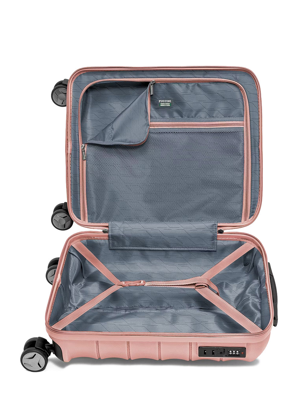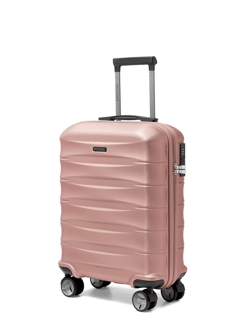 Walizka kabinowa Puccini Cairo to idealne połączenie elegancji, trwałości i wygody. Wykonana z twardego ABS-u, posiada zamek szyfrowy, teleskopową rączkę i cztery obrotowe kółka 360°, które zapewniają komfort i swobodę podróżowania.