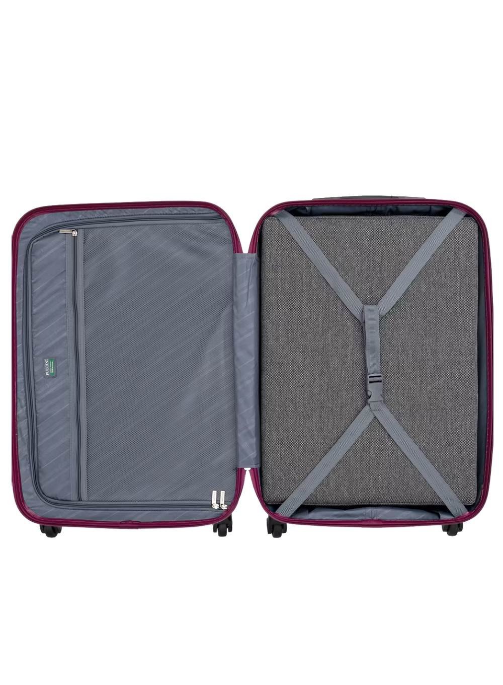 Wnętrze walizki jest podzielone na na dwie części. Dolna komora posiada regulowane pasy, uniemożliwiające przesuwanie się bagażu, a górna zapinaną na zamek tekstylną przegrodę z kieszenią. Wewnątrz znajduje się dodatkowa, mała kieszonka zapinana na suwak na kosmetyki, kable i inne akcesoria.