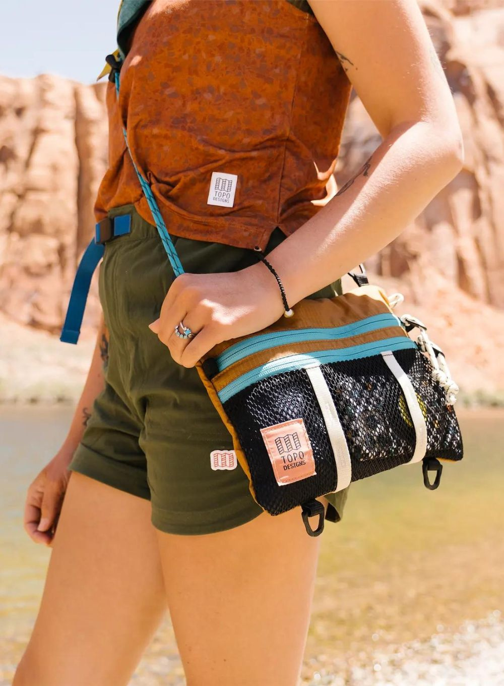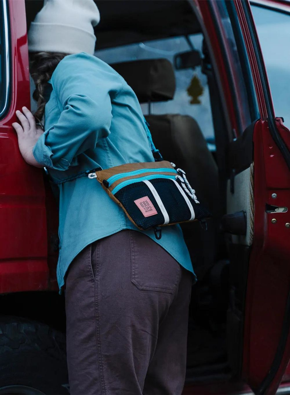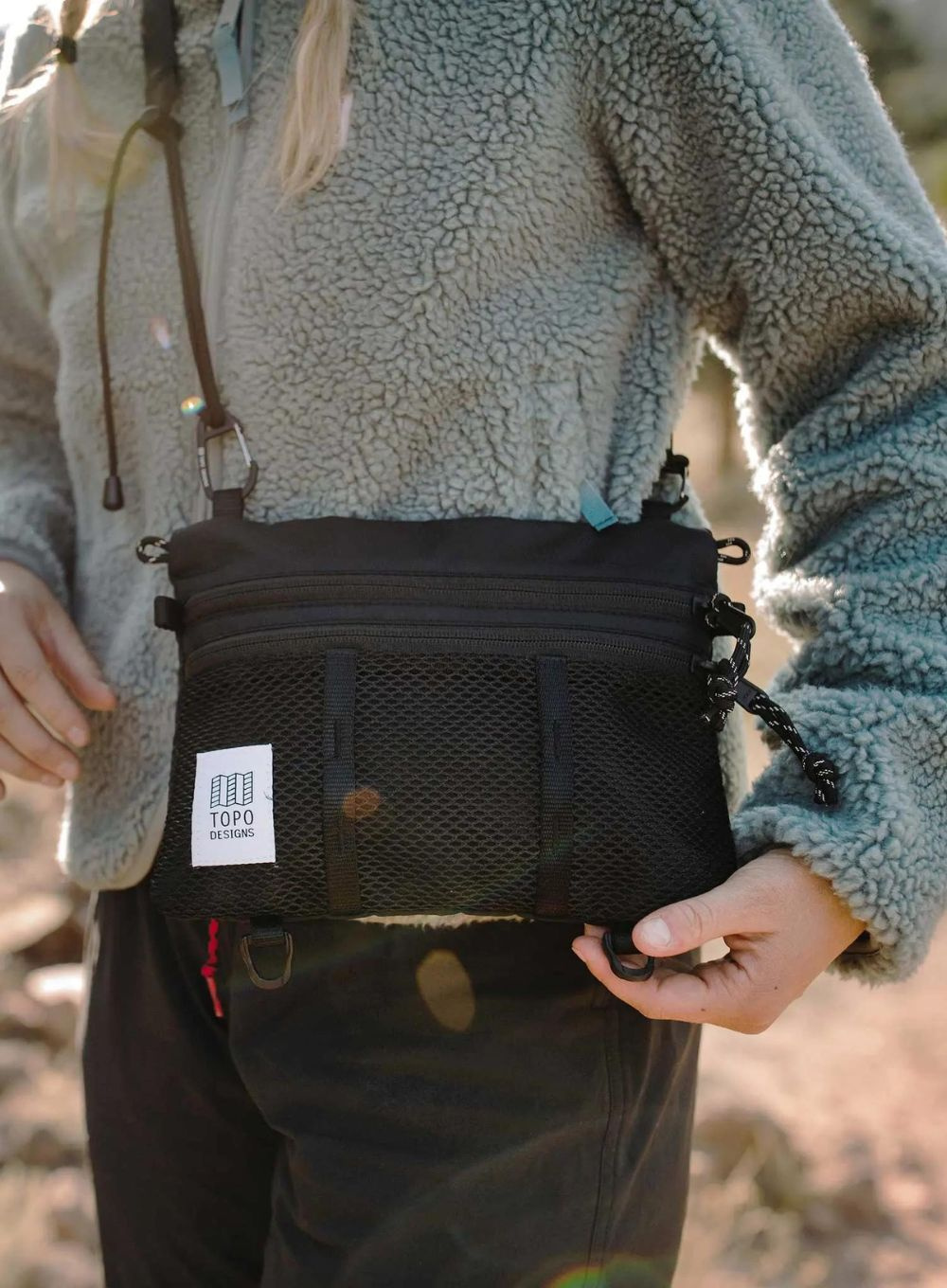 Charakterystyczna torba na akcesoria, przekształcona w torbę na ramię Topo Designs Mountain Accessory, z dodatkowym regulowanym paskiem na ramię i zewnętrznymi kieszeniami zapinanymi na zamek na telefon, mniejsze przedmioty lub klucze.