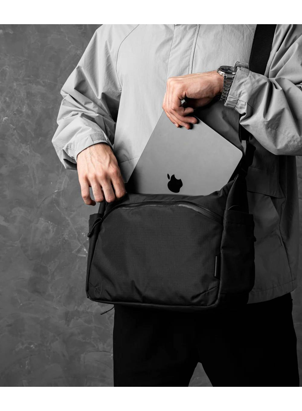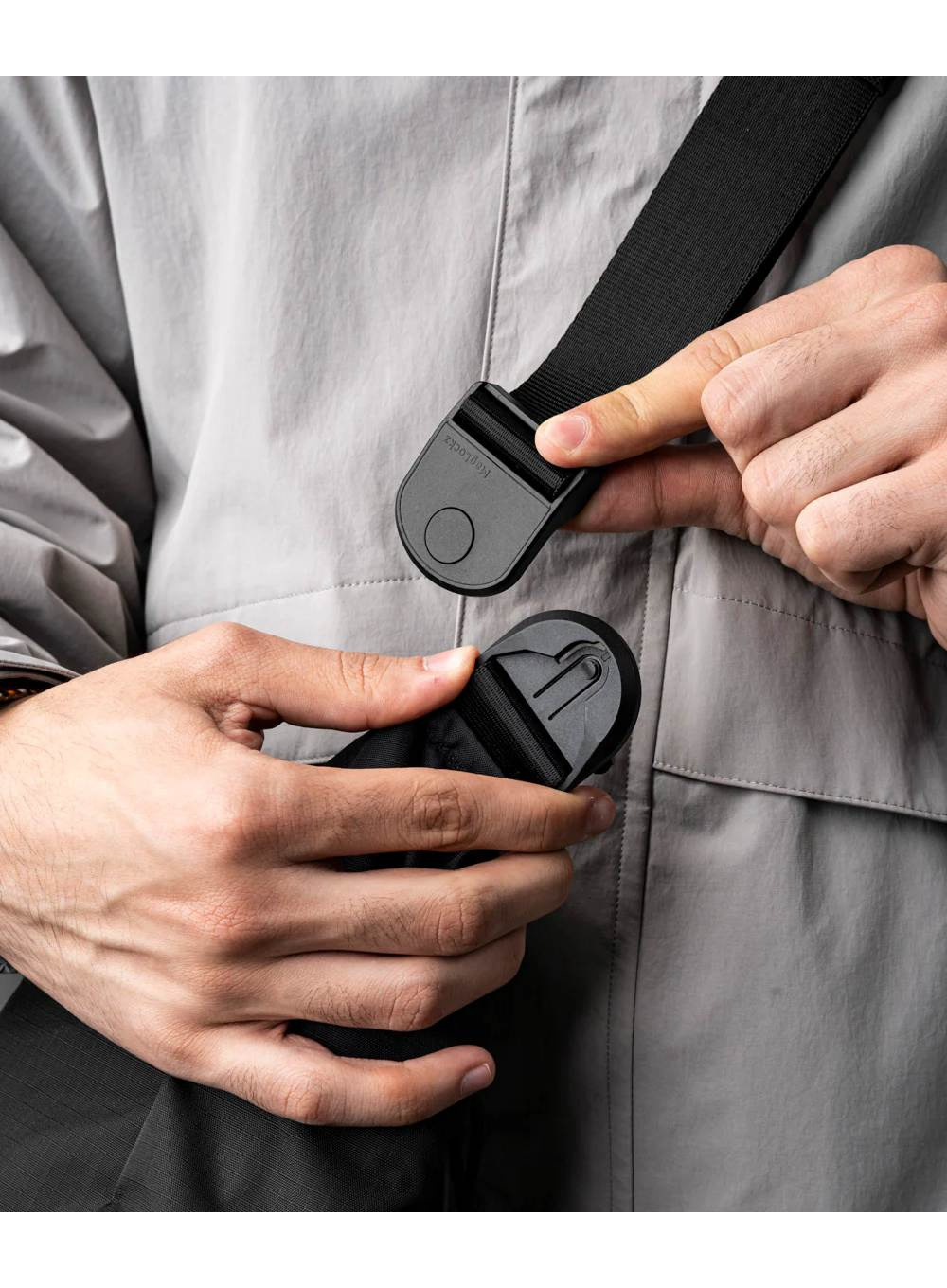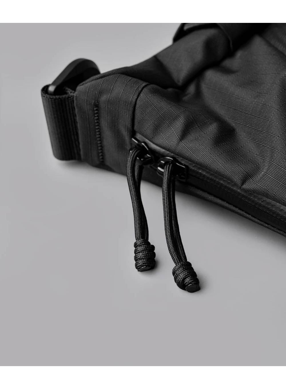 Hydrofobowe zamki YKK AquaGuard, odporny materiał Axoflux 210D (nylon ripstop z recyklingu) oraz przelotka na uchwyt walizki sprawiają, że Flight Satchel to idealny towarzysz codziennych dojazdów, pracy i podróży.