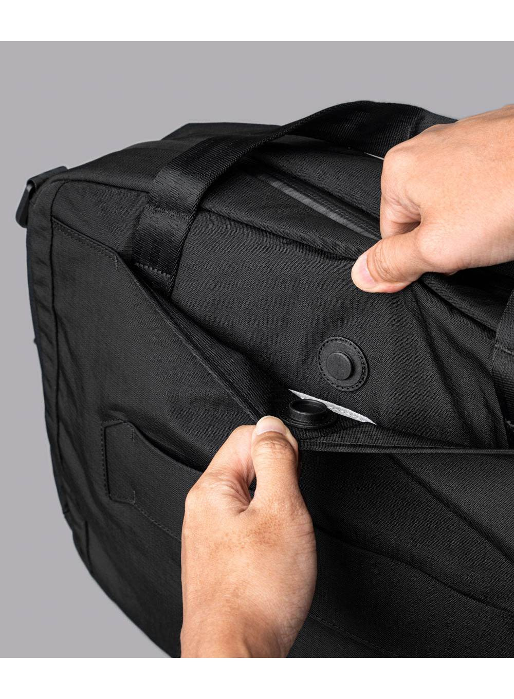 Torba oferuje dwa sposoby noszenia – w dłoni lub na ramieniu, z możliwością szybkiego przepięcia paska dzięki magnetycznym klamrom Maglockz. Dodatkowo wyposażona jest w kieszeń z magnetycznym zamknięciem na telefon, przelotkę na uchwyt walizki oraz wewnętrzną kieszeń na butelkę z wodą.