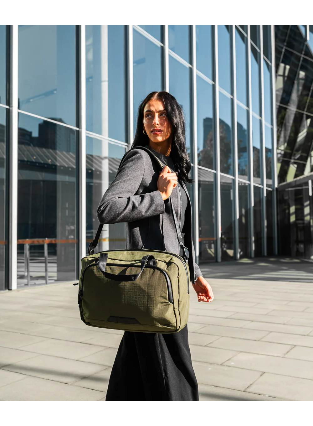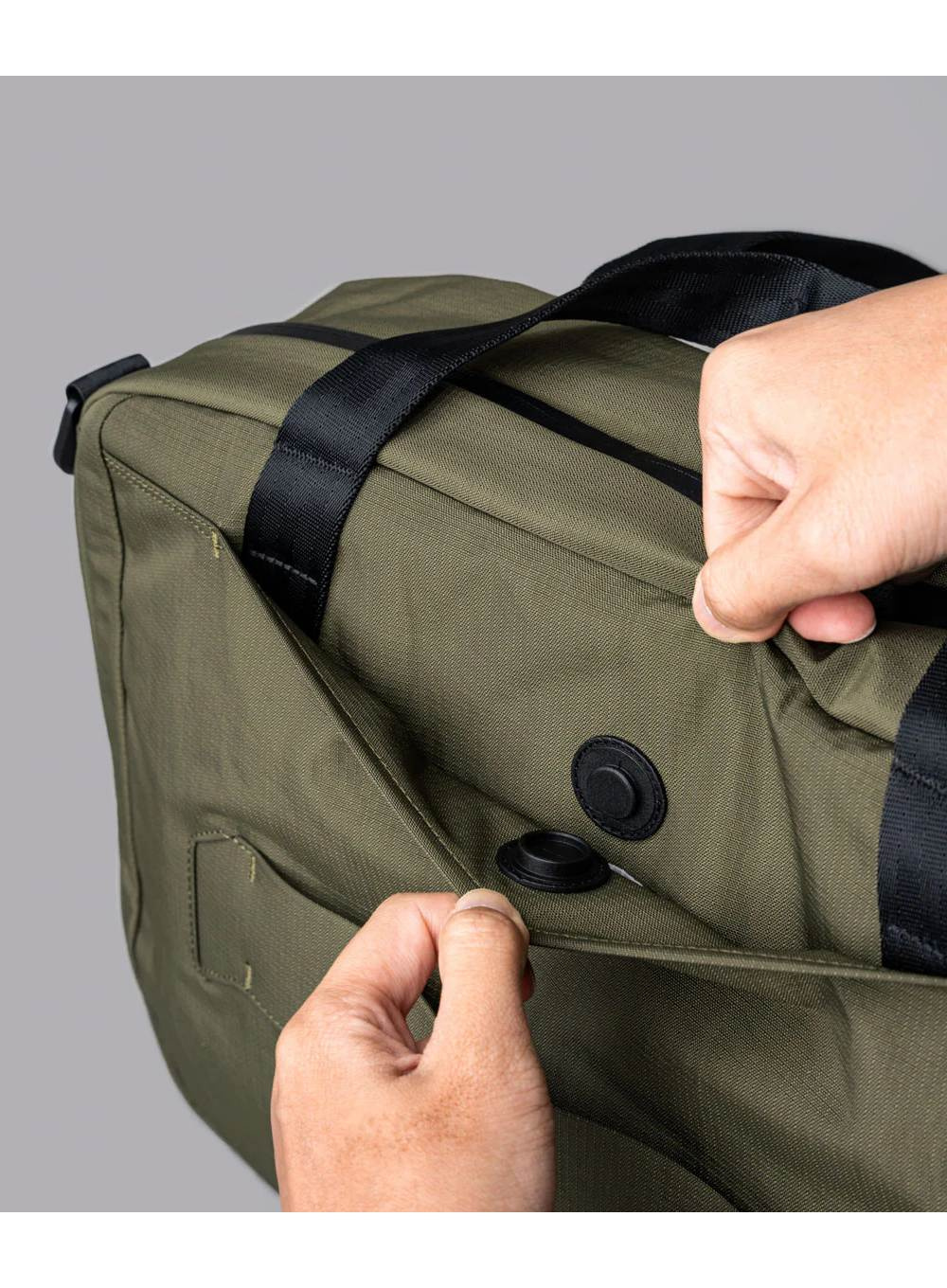 Torba oferuje dwa sposoby noszenia – w dłoni lub na ramieniu, z możliwością szybkiego przepięcia paska dzięki magnetycznym klamrom Maglockz. Dodatkowo wyposażona jest w kieszeń z magnetycznym zamknięciem na telefon, przelotkę na uchwyt walizki oraz wewnętrzną kieszeń na butelkę z wodą.