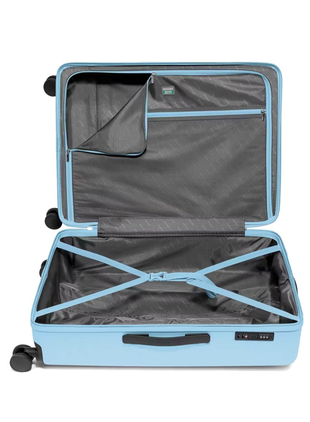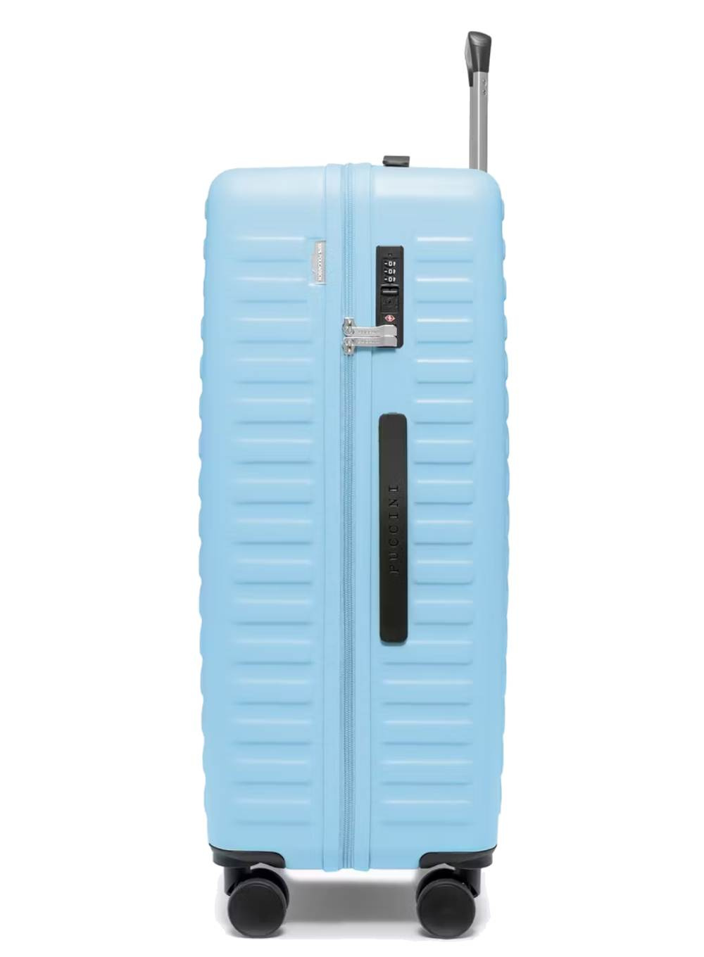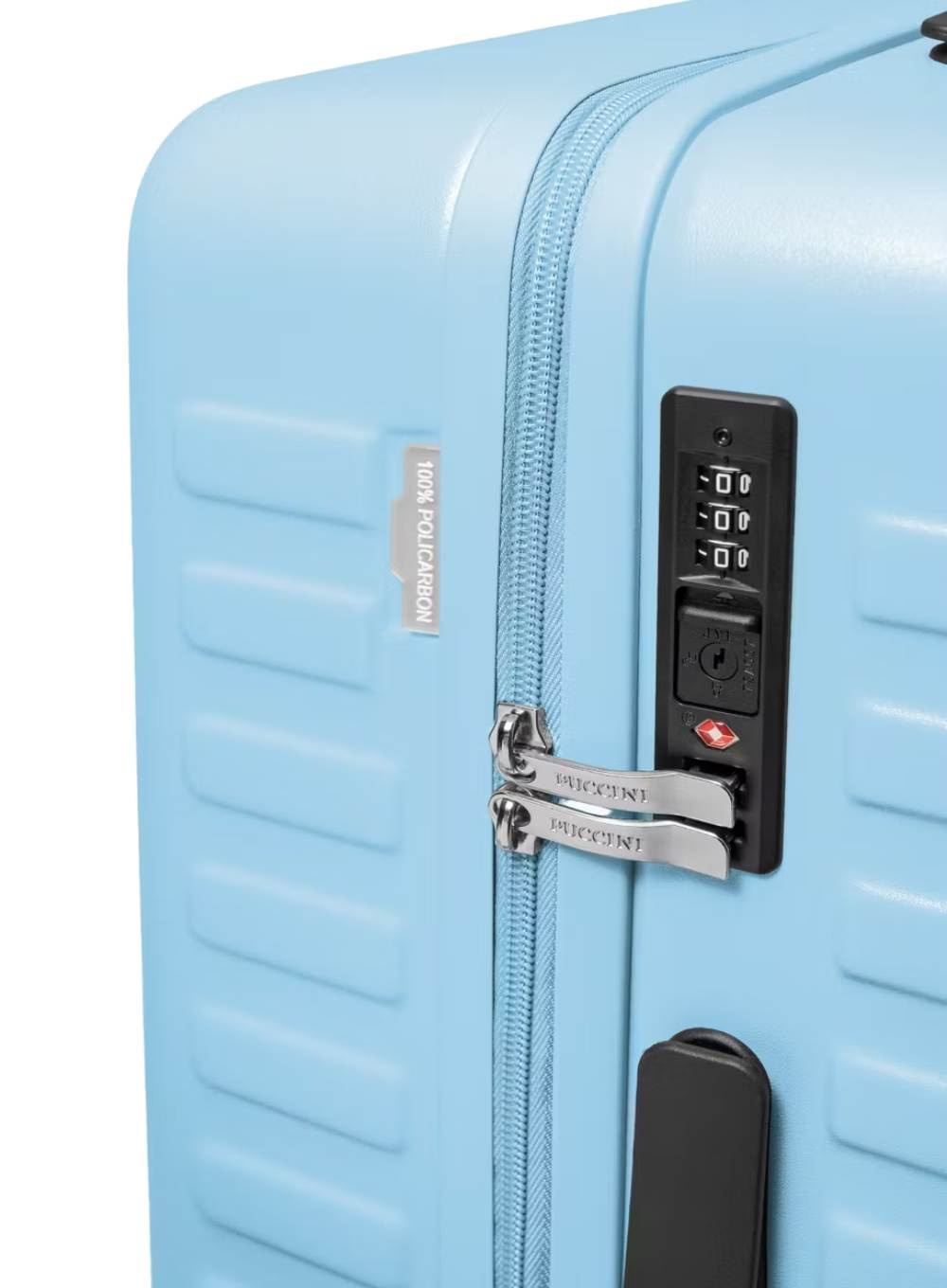 Korpus walizki zdobią eleganckie, wypukłe pasy, które nadają jej nowoczesny i stylowy wygląd. Subtelne logo PUCCINI na froncie podkreśla prestiżowy charakter kolekcji Munich. To idealny wybór dla osób często podróżujących, które oczekują niezawodności i elegancji w jednym produkcie.