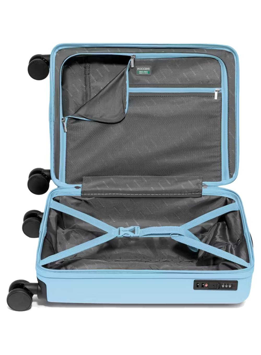 Wnętrze walizki podzielono na dwie praktyczne komory – jedna zamykana przegrodą na suwak z dużą kieszenią z siatki, druga wyposażona w pasy mocujące. Takie rozwiązanie zapewnia porządek i zabezpiecza rzeczy przed przemieszczaniem się w trakcie podróży.