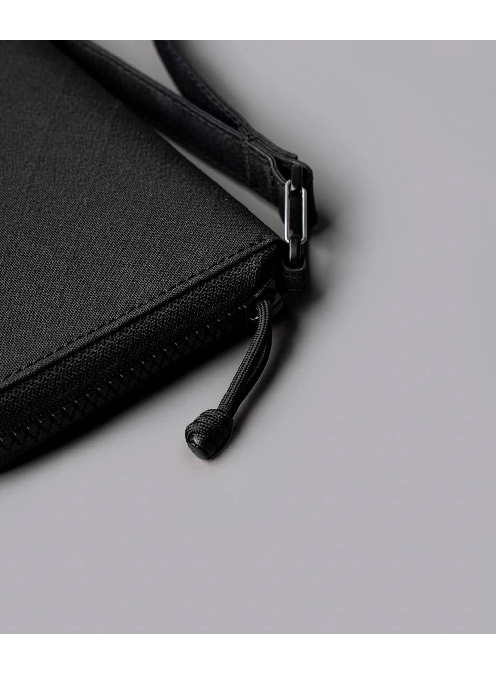 Zamek błyskawiczny zabezpiecza zawartość, a odpinany pasek na nadgarstek z klipsem Maglockz pozwala wygodnie przenosić portfel i szybko przechodzić przez kontrolę bezpieczeństwa.