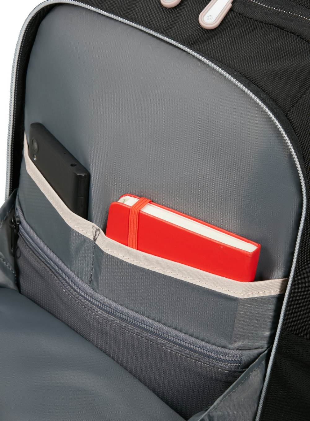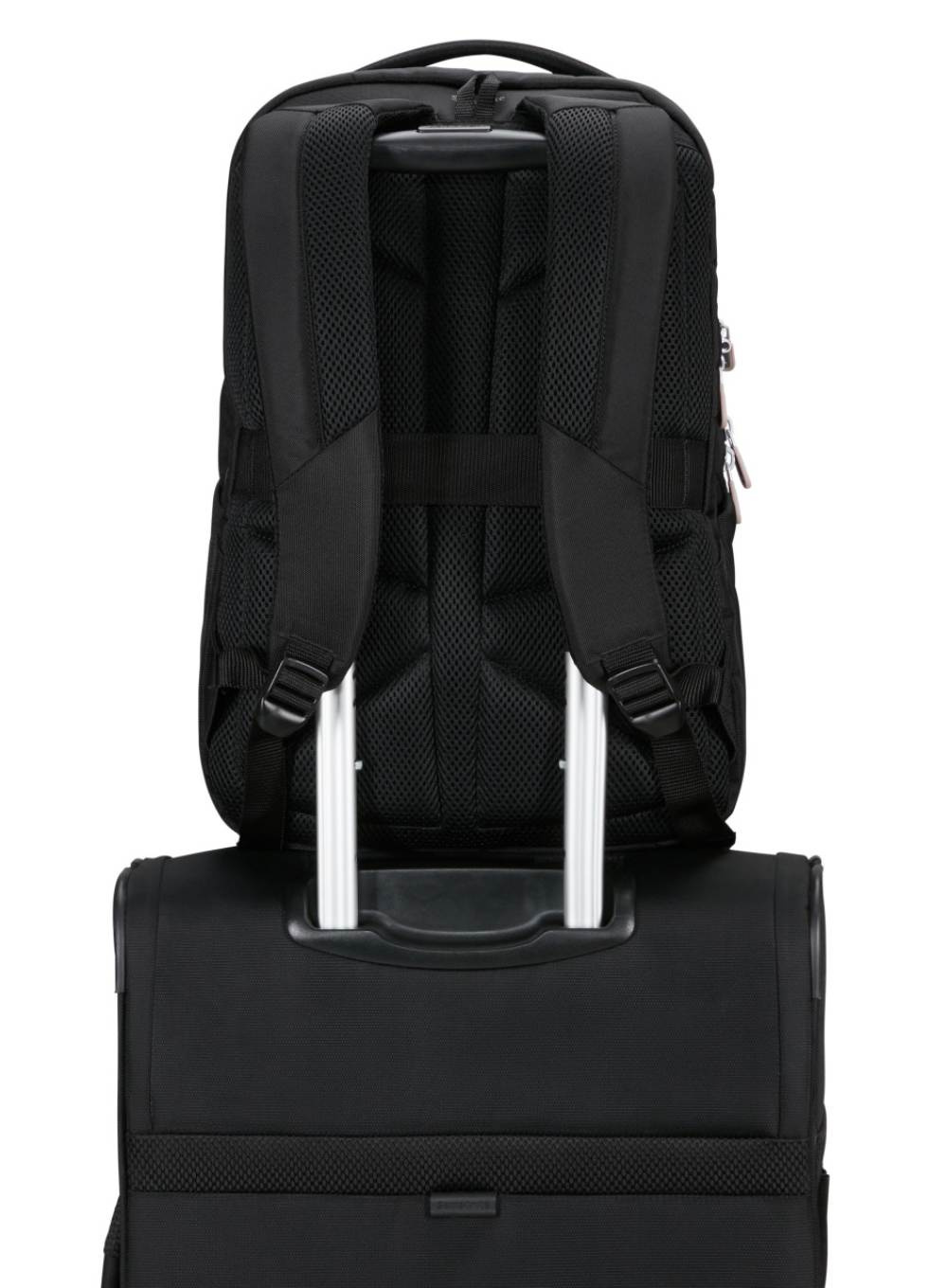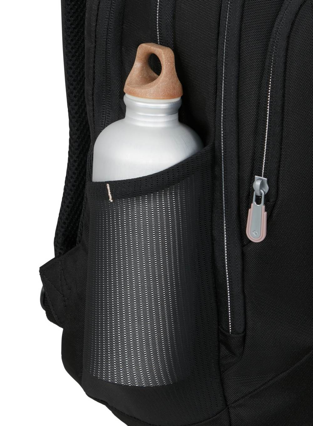 Ergonomiczne szelki, lekka konstrukcja oraz miękki panel tylny zapewniają komfort noszenia nawet podczas długich dni w ruchu. Poliester z recyklingu PET chroni zawartość, a pasek Smart Sleeve ułatwia transport z walizką.