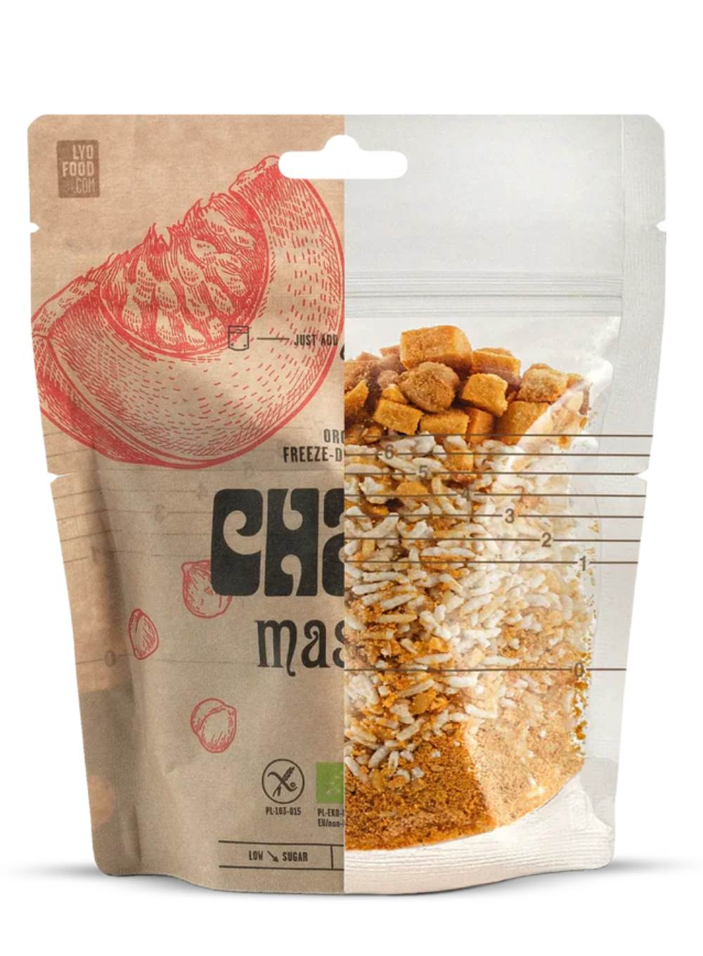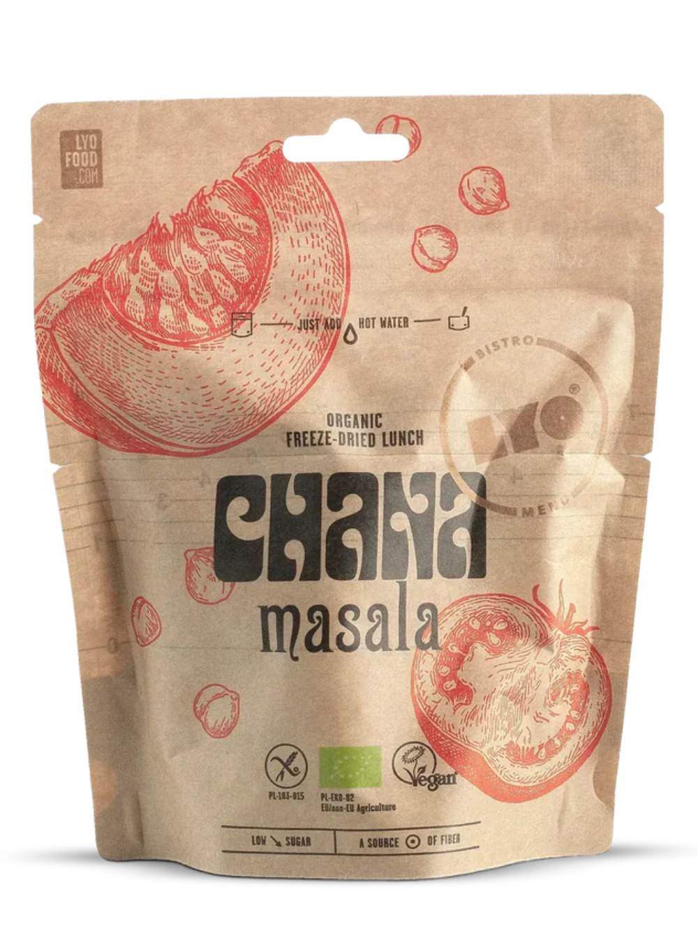 LyoFood Chana Masala 270 g to ekologiczne, liofilizowane danie wegańskie z ryżem, bez glutenu i laktozy, o intensywnym indyjskim smaku, gotowe w 10 minut.