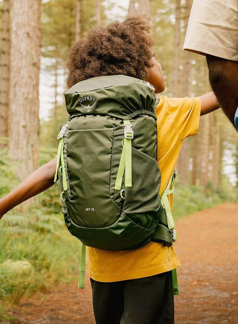 Osprey Jet 18 to lekki plecak trekkingowy dla dzieci w wieku 5–13 lat, zaprojektowany do jednodniowych wędrówek i aktywności outdoorowych.