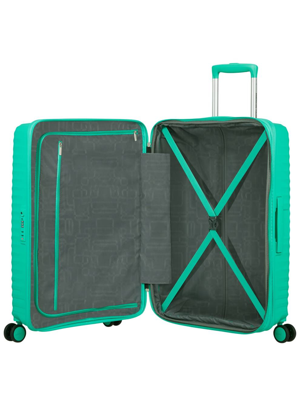 Podwójne koła obracające się w zakresie 360° zapewniają płynne i stabilne prowadzenie, a ergonomiczne uchwyty oraz teleskopowy wysuwany uchwyt na podwójnym stelażu zwiększają komfort użytkowania. Zintegrowany zamek TSA podnosi poziom bezpieczeństwa, natomiast funkcjonalne wnętrze z pasami i przegrodą z kieszenią ułatwia pakowanie.